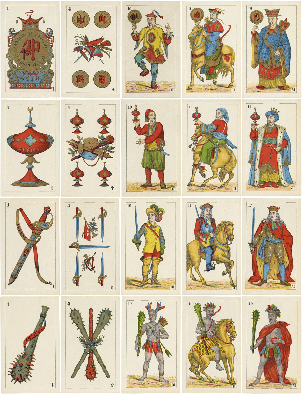 Four Continents fantasy playing cards by Daveluy, Bruges, Belgium, 1860-1885.