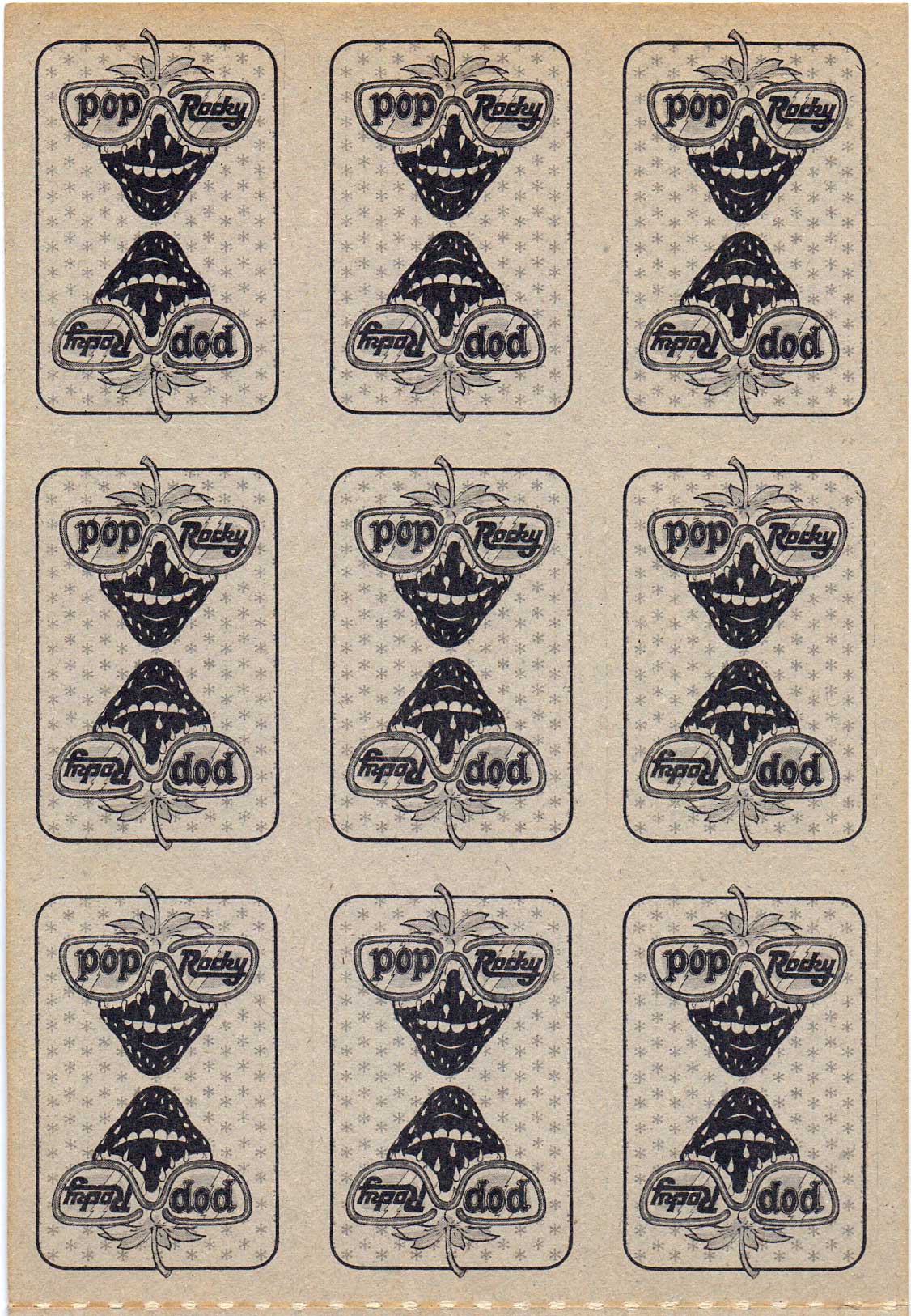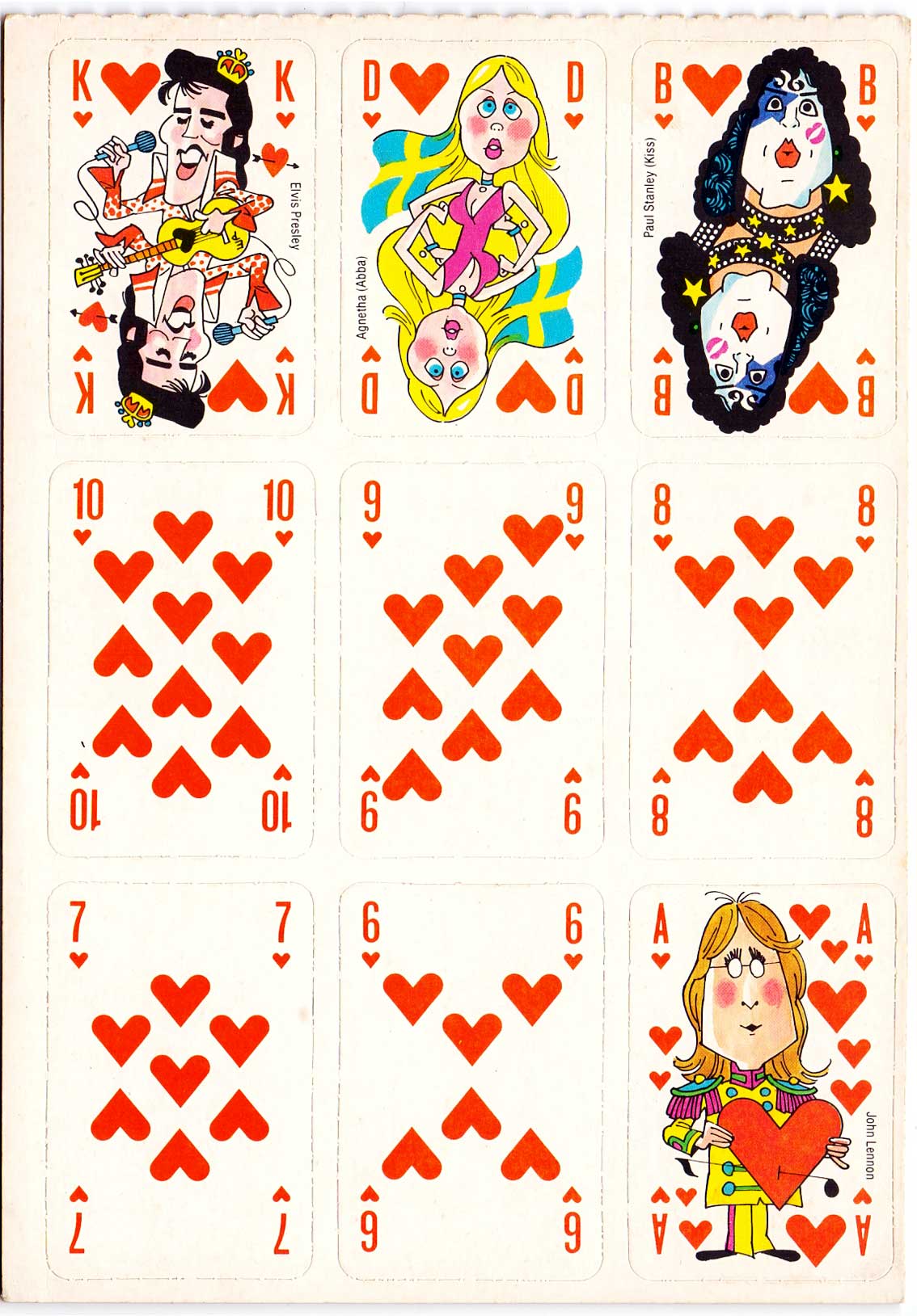 Two uncut sheets of “Pop Rocky” miniature playing cards with double-ended caricatures of celebrities and pop stars, originally published inside a magazine, c.1970. Made in Belgium. Includes Jimi Hendrix, Mick Jagger, Elvis Presley, Cliff Richard, with the four Beatles as the Aces. Reverse: strawberry design with “Pop Rocky” logo in sunglasses. 36 cards.
