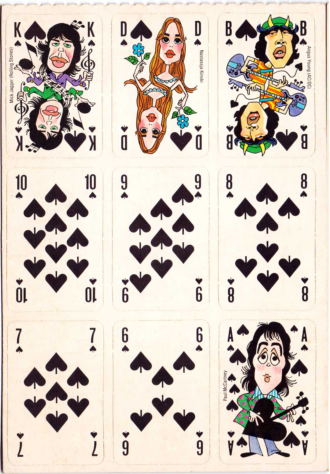 “Pop Rocky” miniature playing cards with double-ended caricatures of celebrities and pop stars, originally published inside a magazine, c.1970.