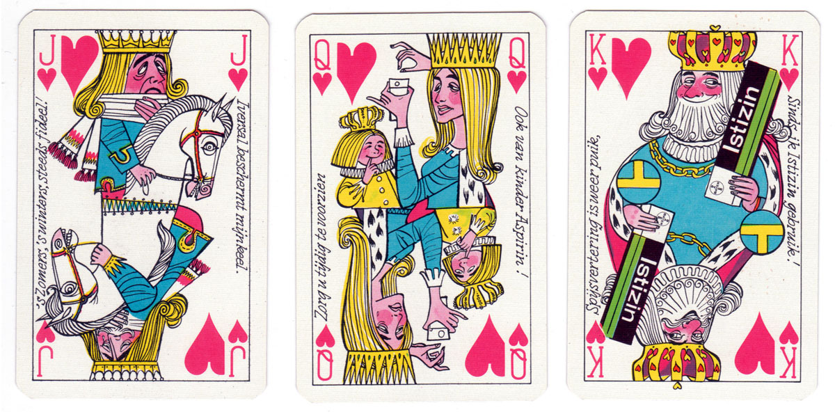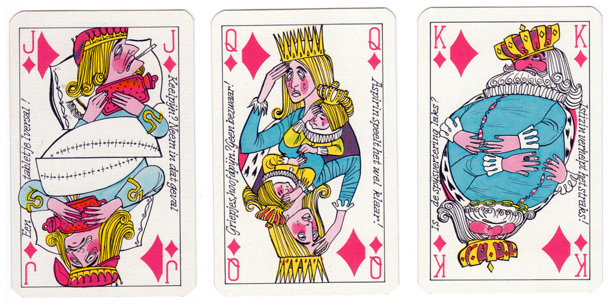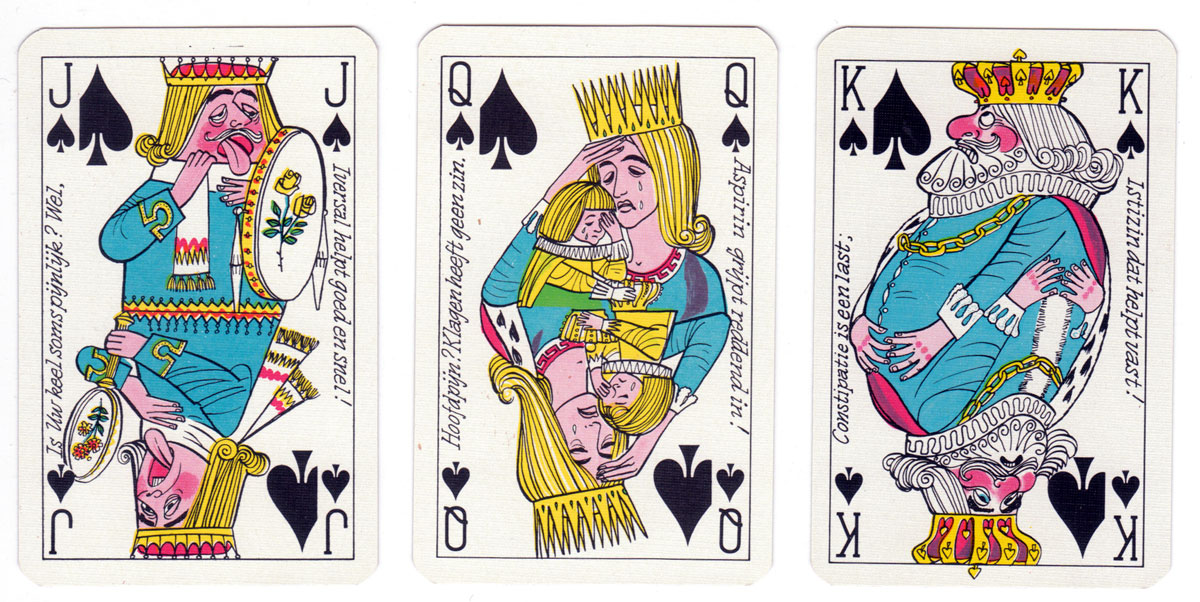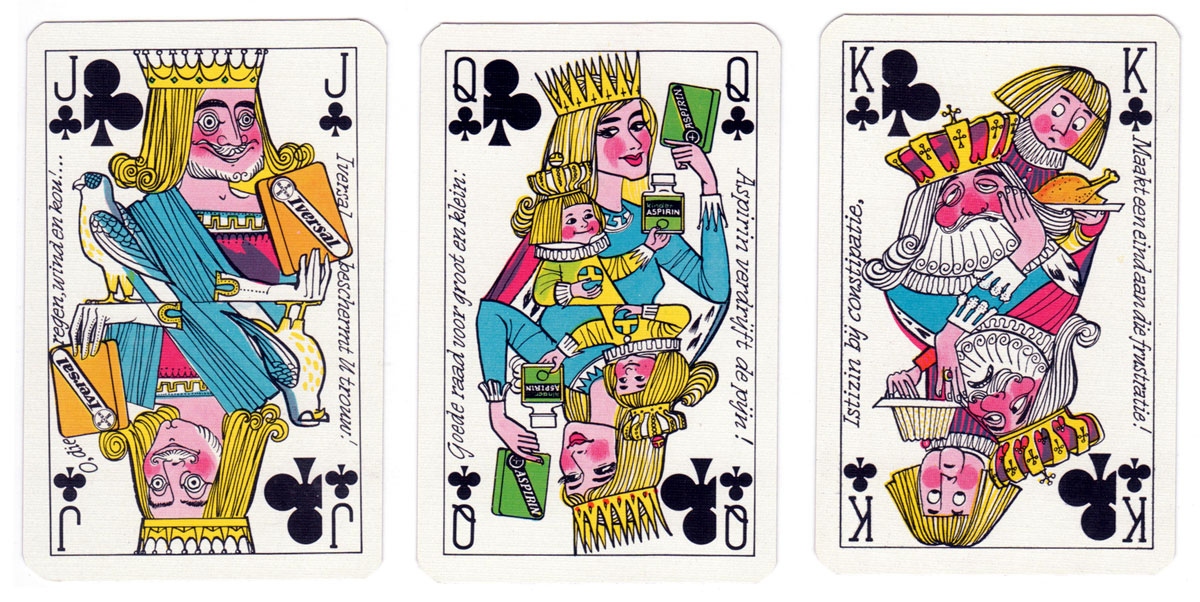 Humorous pharmaceutical deck made by Antoine van Genechten for Bayer, c.1963.