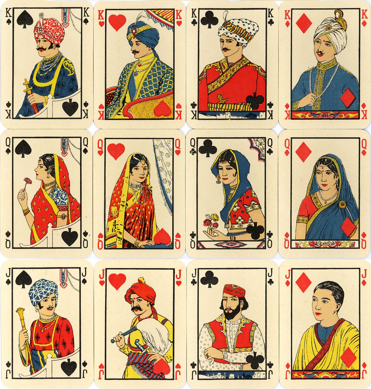 Dilkhus playing cards were manufactured for Kamala Soap Factory (Calcutta, India) by Etablissement A. Van Genechten S.A. (Turnhout, Belgium) in 1922. The courts depict dignified three-quarter height portraits with extra decorative motifs suggestive of Indian culture. Van Genechten was one of the most competent cardmakers in Turnhout and they produced almost every kind of foreign pack for clients all around the world. Overseas markets included East Asia, Australia, India, North Africa, South America and, of course, Europe. Their cards were familiar to the fingers of players in far-off places!