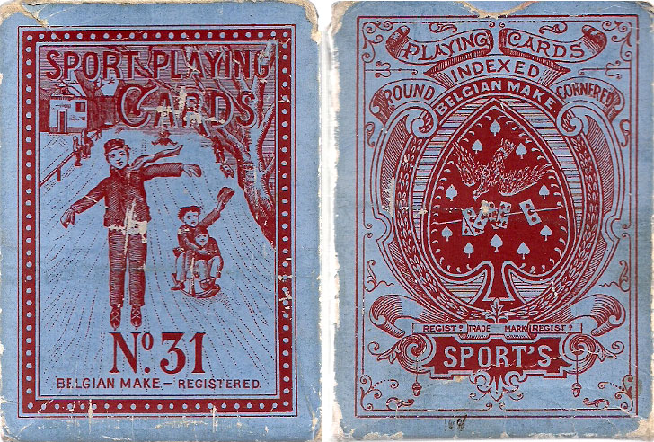 Above: 'Sport No.31' playing cards manufactured by A. van Genechten, Turnhout, Belgium, c.1910. The Ace of Spades was a registered trade mark since February 1885, and this was followed in 1888 by the Sailor Joker designed by Houssiaux of Brussels. The court cards appear to be inspired by the designs of De la Rue. Images courtesy Rod Starling.