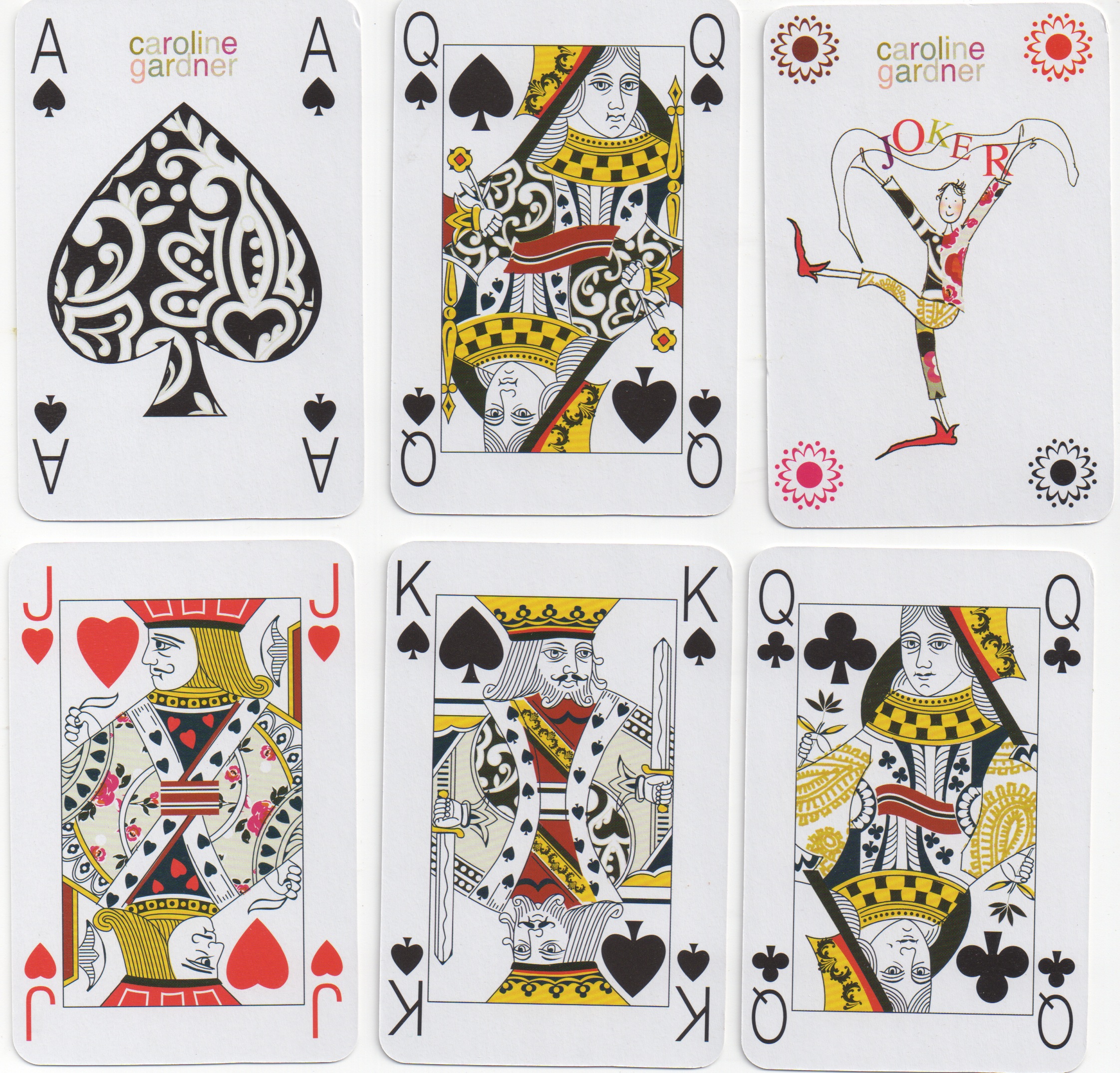 C4 is made in China for Caroline Gardner, who seems to be a fancy goods and gifts designer. The courts are based on CUS7 and have fabric designs added to the clothes, the same one for the courts of one suit. The QD is actually a duplicate of the QH with clothing differences. There is a special joker. The double box was bought at the Royal Horticultural Society's shop at Wisley in 2011.
