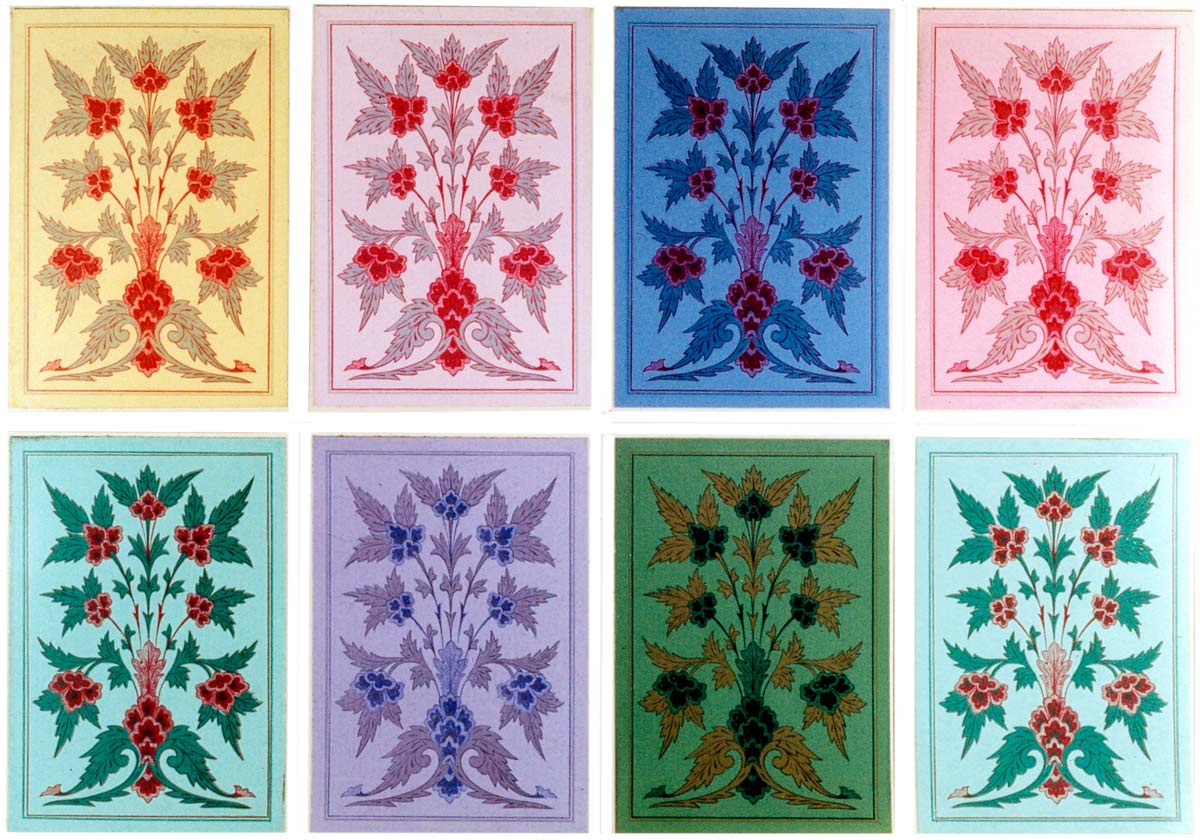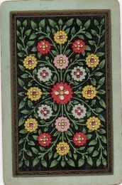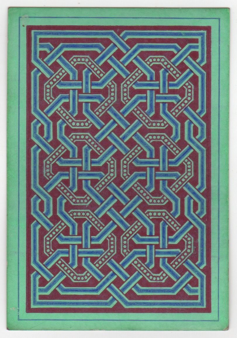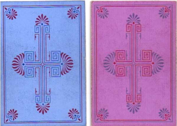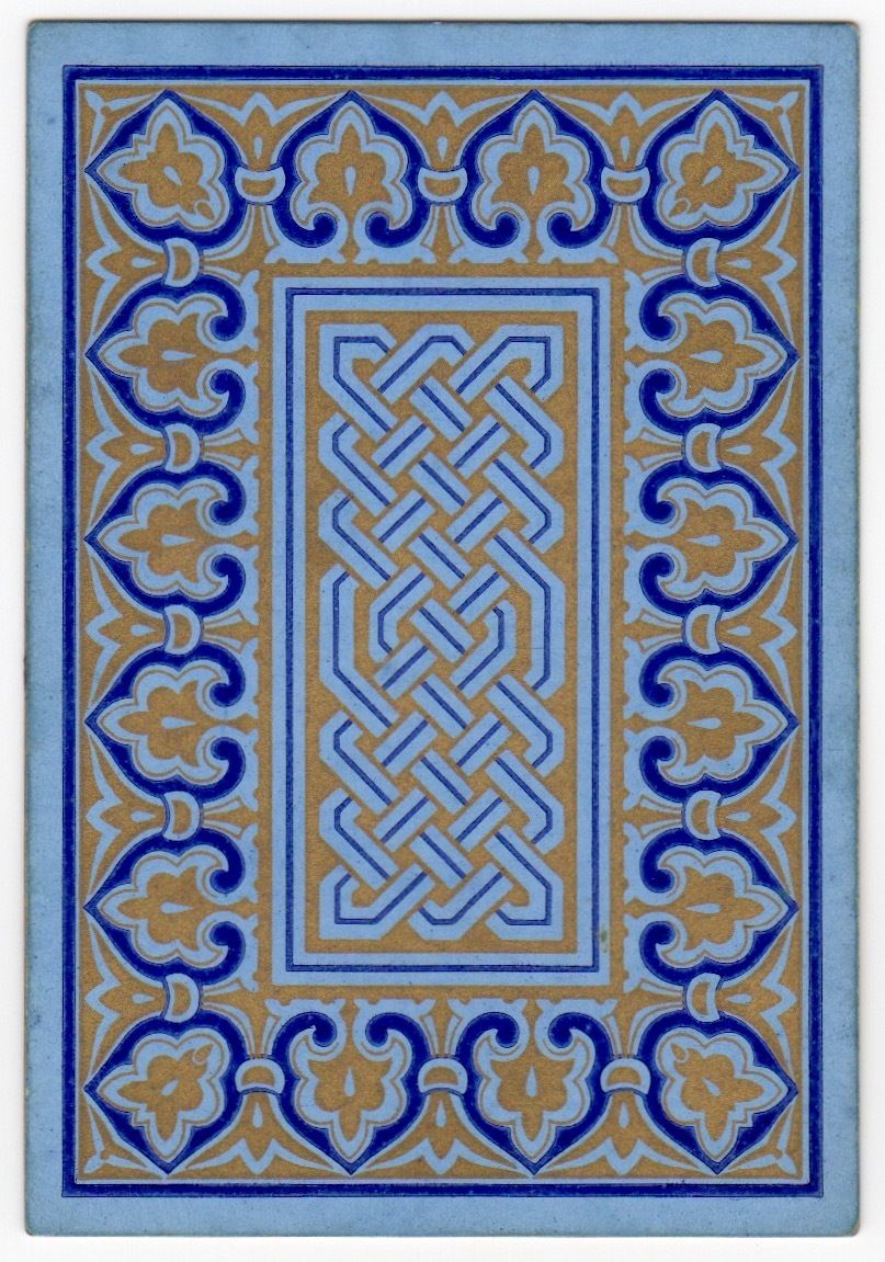 We need to see the designs in the context of Jones's major work The grammar of ornament, published first in 1856. For the most part, this is not the source of the designs he made for De La Rue, but it is the inspiration. The grammar is a collection of actual decorative motifs from all over the world, put together in an attempt to lay the foundations of all ornamentation in the Victorian period. He uses the word grammar to refer to the basic component parts from which decoration can be fashioned and hopes to have captured all there is to capture in actual examples. There are a few actual examples from the grammar to be found on the backs of cards. Strangely, some of them are fairly uninspiring. For example, there is an all-over one that is used in cheap packs, e.g. Andrews, which comes from China and is taken from decorative porcelain. So, this is not a design by Jones, but one taken from his source book. Later it was turned through 90º and produced in various colours.
