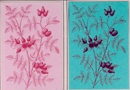 So, based on all the material I have discussed so far, the list of numbered and/or named designs (some without an illustration) is as follows: 48-51 4 Pompeian; 63 Tartan; 77 Persian; 79; 84*; 87 Cotton Plant; 90*; 119 Indian Corn; 121 Passion Flower; 125 Cineraria; 127 Ripening Olive; 129 Nasturtium; 137 Oriental; 142 Olive Branch; 143-148 6 Chinese; 150 Acorn; 152 Persian Rose; 156 Indian Rose; 157 Italian; 158 Prince of Wales; 160 Indian Feather (in the 1868-69 catalogue the sample card is incorrect, as it's actually the Indian Rose design); 161; 162 (Pompeian); 163 Indian Jewel; 164; 165; 166; 167; 168; 169 Indian Flower; 170 Mille Fleurs; 171 Indian Border; 172; 174*; 175* Peach Blossom; 180 (Pompeian); 181; 182 Indian Frieze; 183 Persian Diamond; 184; 185; 186; 187; 188; 190; 192 Chinese Flowers; 193 Mayflower; 194; 195 White Rose; 196; 200; 202; 204; 205; 206; 207 Indian Jonquil; 210; 211; 213; 214; 219 Fuchsia; 220 Sweet Pea; 223 Princess of Wales. 137 and the numbers from 150 onwards are all stock numbers *with the exception of 84, 90, 174 & 175, which are design numbers. In addition, the following named designs are listed in reviews of De La Rue's cards, the description by Charles Dickens of a trip to the De La Rue factory in 1852, in an advert from 1865 and in an in-house list from 1866, without any illustration: Fuchsia, Cherry Tree, Blue-bell, Forget-me-not, Daisy, Carnation, Ears of Wheat and Barley, Shamrock, Cineraria, Olive, Plum, Pomegranate, Peach, Geranium, Raspberry, Oriental Gold, Willow Pattern. Some of these can be paired with actual examples with some certainty. What we don't know for certain is whether some of the designs kept their names, but underwent stylistic changes. For example, the Geranium design of c.1867 (D303), shown below, can't be the same as the one seen by Charles Dickens in 1852. It was not even the one on the left, because in the new material this is number D420 and dated 1871. Even the simple designs, such as Tartan, have different temporal versions. The ones in the slideshow above from 1868-69 are not the same as the one below from c.1855. In The Stationer and Fancy Trades' Register of July, 1878, there is a specific reference to "combinations and modifications" and "improvements upon old favourites", listing examples such as 381 Indian bouquet and 302 Hindoo rose, which suggests revision and reformulation of earlier designs.