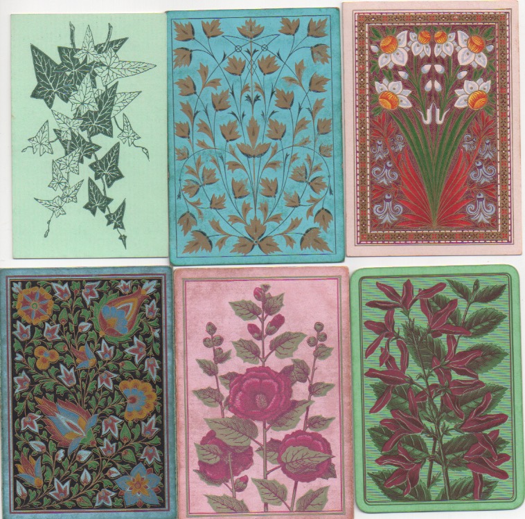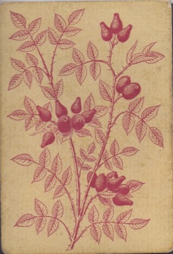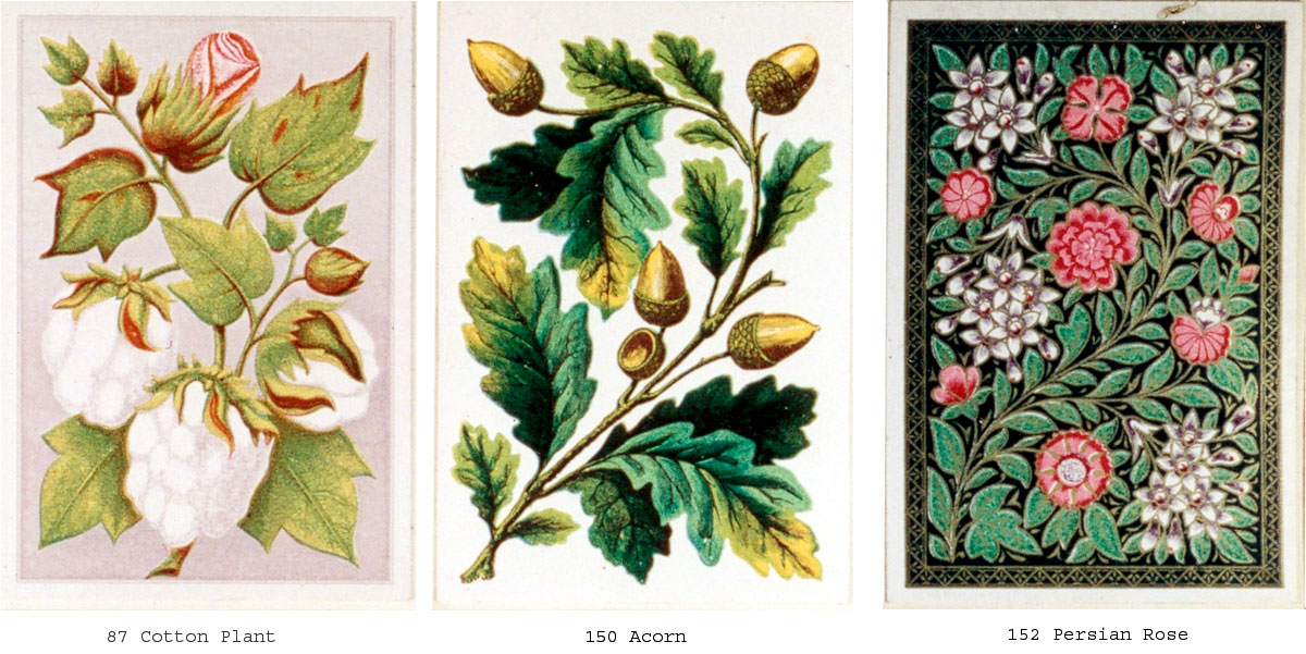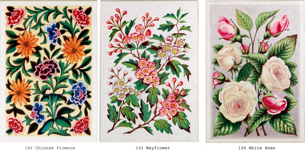 An example that was drawn by Jones comes from the final section of the Grammar in which he exemplifies leaves and flowers from nature in black and white outline on a buff ground (except for Plate XCVIII, which is in full colour). In this case the subject is a rose branch with hips. Again it was used in relatively cheap packs, as it has an all-over colour background. I have seen a copy of this in a Belgian pack imported into this country by Alfred Davis.