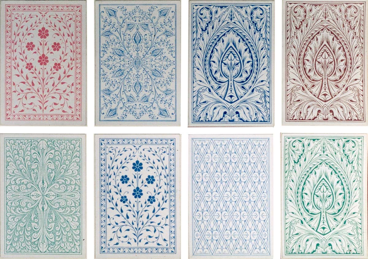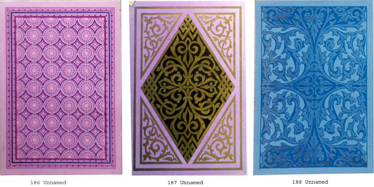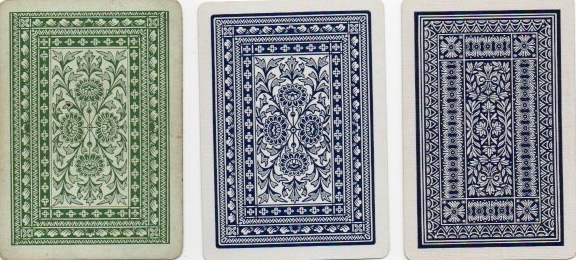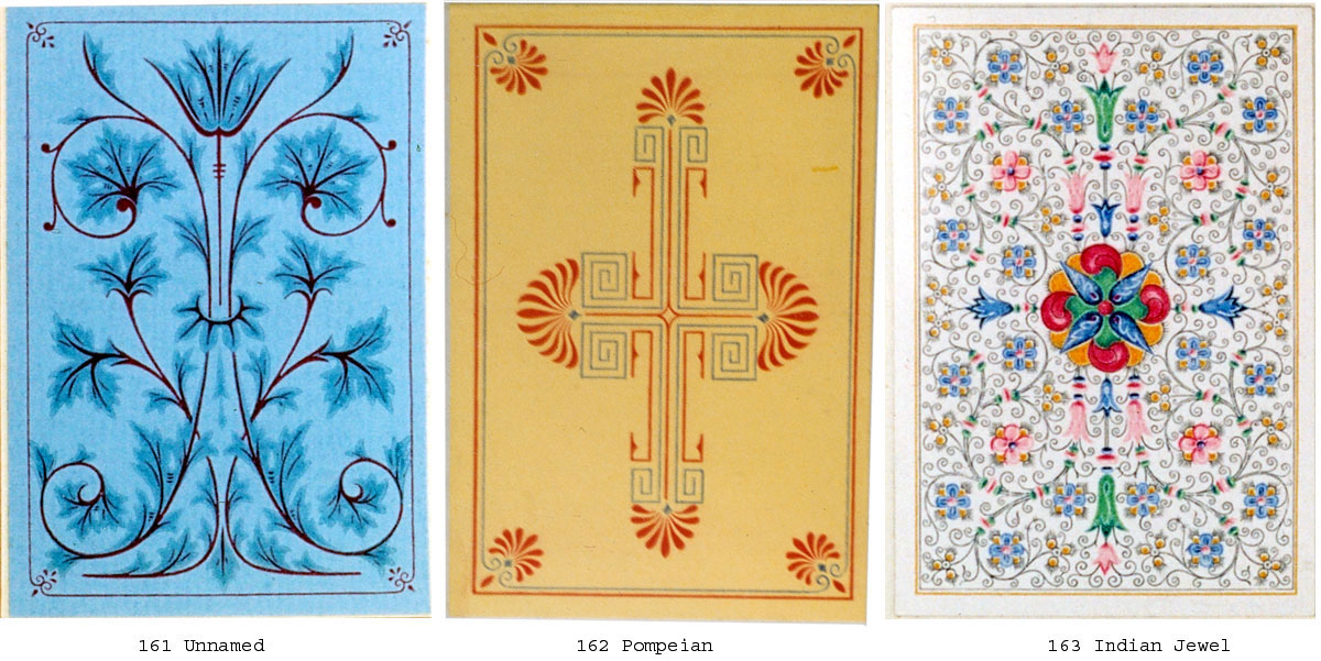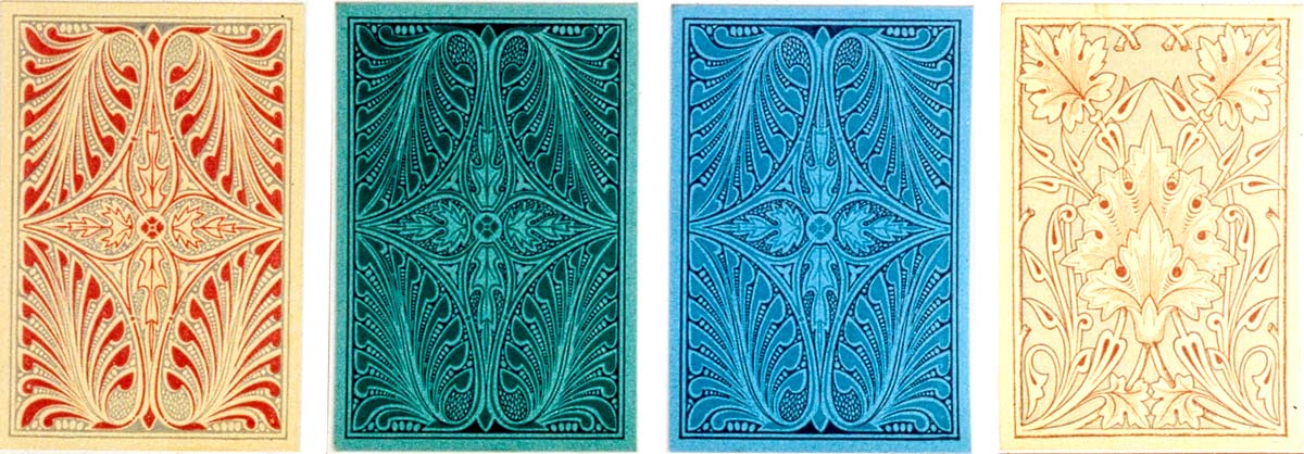 Although Reynolds claimed to have been the first to decorate playing card backs, it was De La Rue who took it to a fine art, thanks to Owen Jones. Once the idea of decorative backs was established, all the other makers followed De La Rue's lead. This occurred mostly from 1862 onwards; I illustrate a few examples from other makers on page 14►