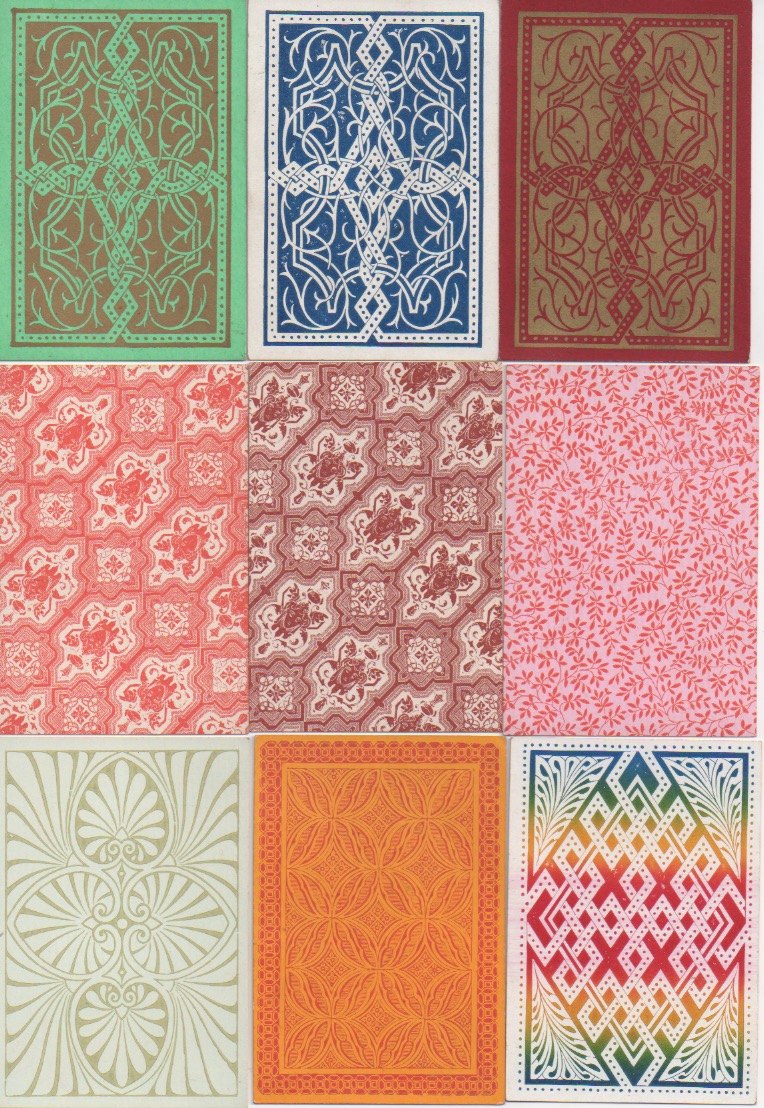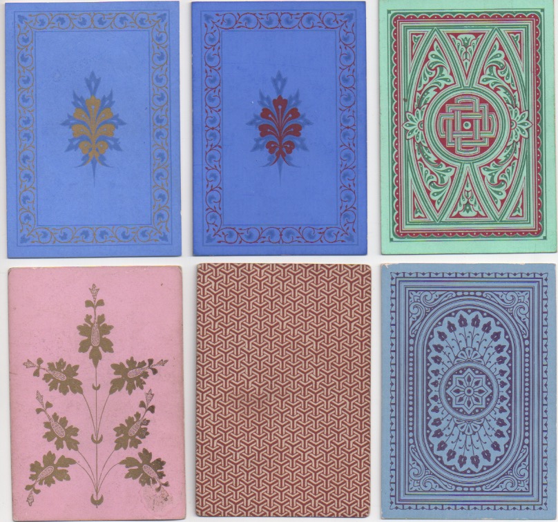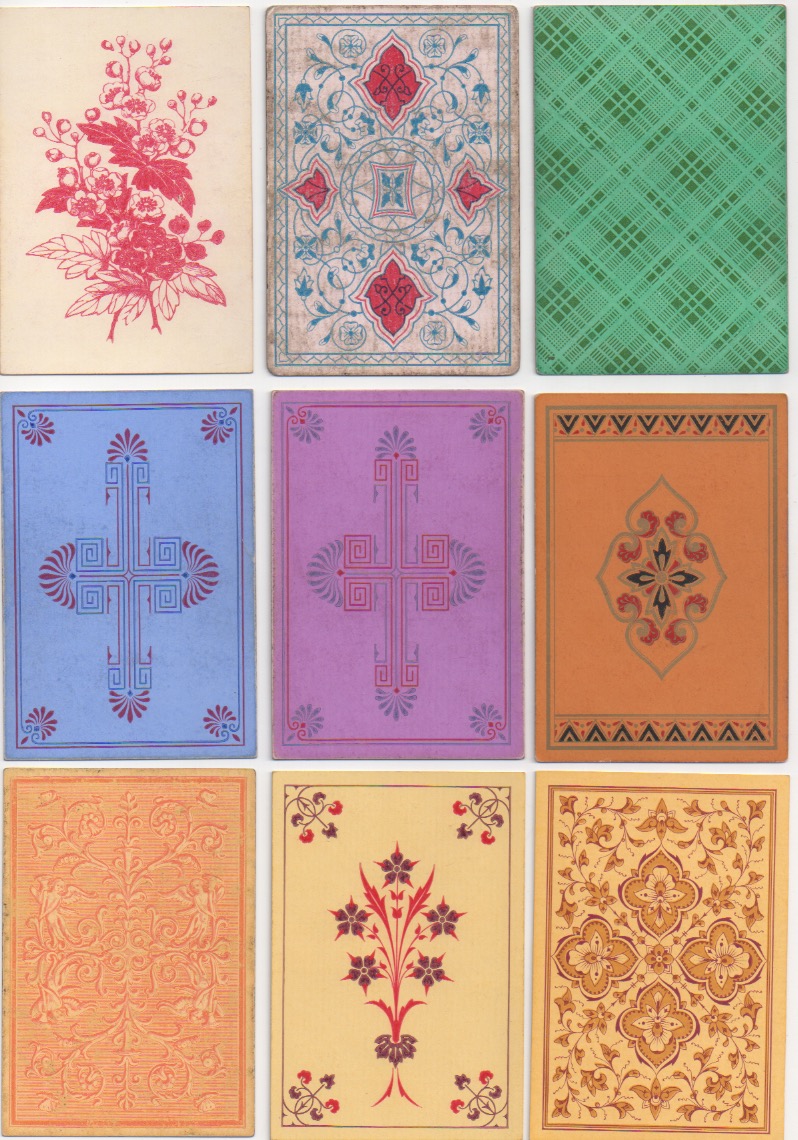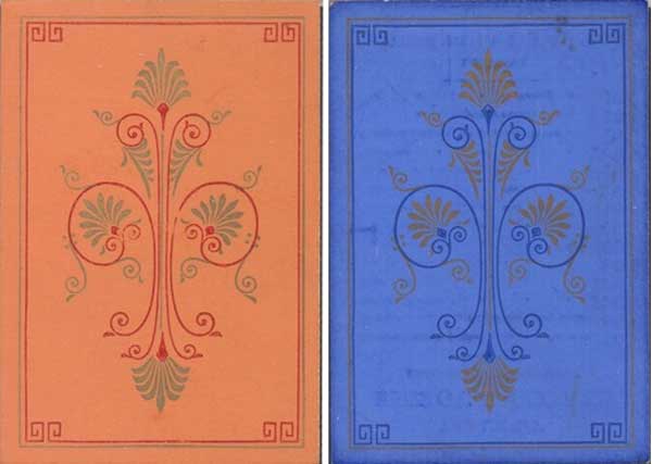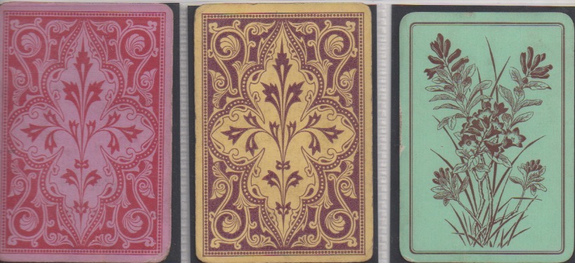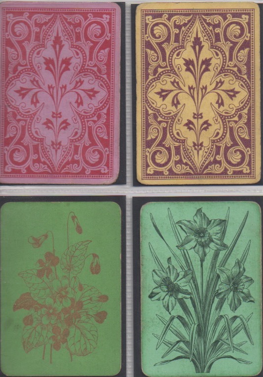 Although Reynolds claimed to have been the first to decorate playing card backs, it was De La Rue who took it to a fine art, thanks to Owen Jones. Once the idea of decorative backs was established, all the other makers followed De La Rue's lead. This occurred mostly from 1862 onwards; I illustrate a few examples from other makers on page 14►