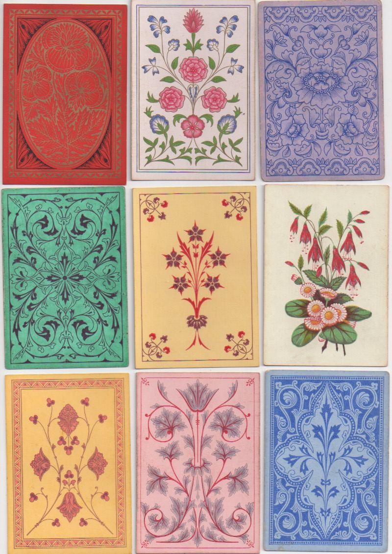 Download “Owen Jones: his work and his legacy part 1 / part 2 / part 3a / part 3b / part 4 / part 5a / part 5b / part 6 / part 7 / part 8”, a fully illustrated guide to DLR backs from 1844 onwards, which were either by Owen Jones or inspired by him. Parts 4 & 5 deal with colour variants of the identified designs; Part 6 presents those designs for which I only have a stock number. Part 7 is a presentation of the as yet unidentified designs by Jones and his co-workers. Part 8 deals with later designs for mostly round-cornered cards produced well after Jones's death. These pages will be undergoing regular revision, as new material comes to light.