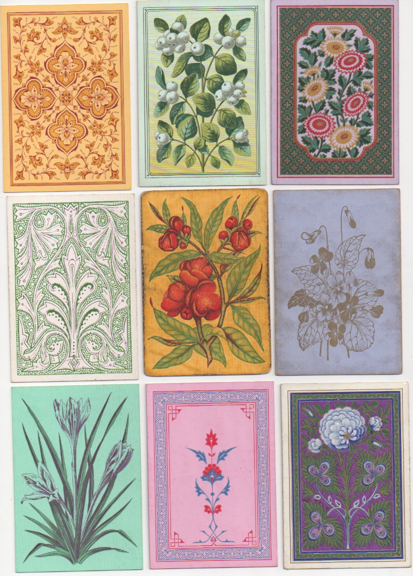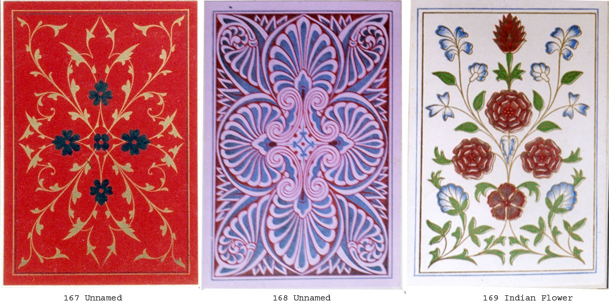 The last of these is dated 1859 in the hand-written list, though it is numbered 78, presumably the design number, but it gives us an idea of how long some of the designs were in use. These designs are listed by Silber & Fleming alongside designs not by Jones, such as S479/D705 Chinese Fisherman, S482 Dovecot and S565/D805 Priestess & Tripod. It is noteworthy that Jones never used animal representations, human or otherwise, in his designs (with the caveat above). The cards on offer in the Silber & Fleming list are unindexed square cornered, round cornered with the patent Dexter indices, and round cornered with what are referred to as "ordinary pips". Whether this is a reference to normal indices or to unindexed cards is not clear, probably the latter.