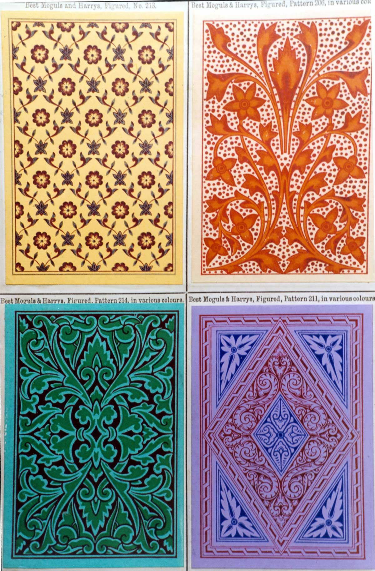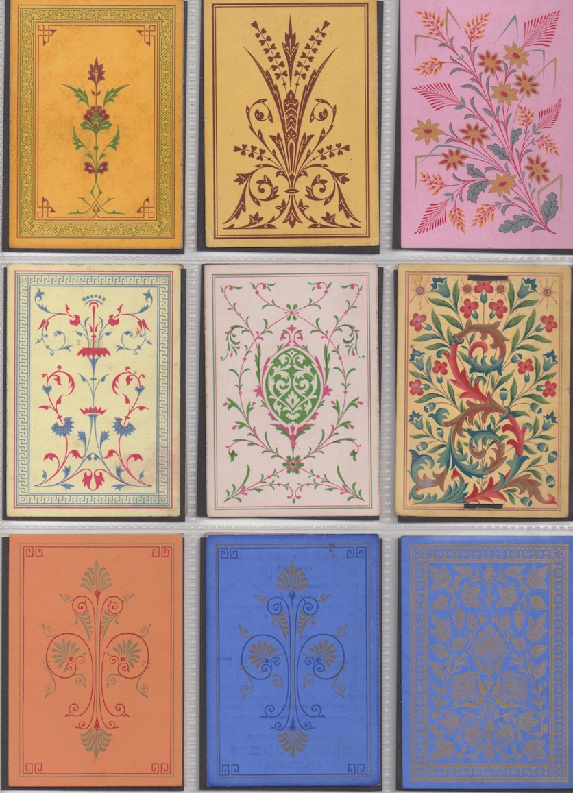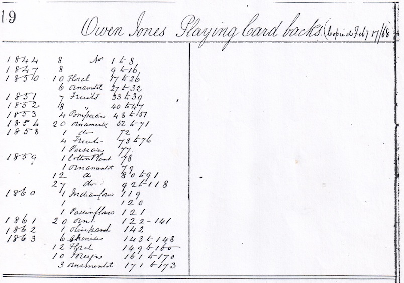 Back in 2006 Mike Cooper and I published an article on Owen Jones with quite a number of illustrations. There are also further illustrations on page 5 of this blog and in my most recent book: The British playing card industry 1600-2000. There is no need to repeat all that information here, but it might be useful to consider in more detail which back designs are definitely by Jones. Because a lot of new material has come to light since I first started this page, it's time to rewrite it to include the information that is now available. This may tale a little while, so you may find inconsistencies in the text, as I revise it in stages. We now have access to many of Jones's original sketches for the back designs which are housed in a university library in Nashville, Texas. I managed to track them down with the help of the United States Playing Card Co. They are contained in a book from the Clulow collection that was bought by that company in 1898. In the light of this new material I have revised the pages attached to this page, as many of the hitherto unidentified designs now have a design number. It is also clear that there are two sets of numbers to deal with: the design numbers, which I have prefixed with a D- and those used by De La Rue in their sales material (stock numbers, prefix S-). In some cases we have both for the same design. For a letter referring to this purchase, see further below. Until recently, further material from the De La Rue archive sold in 1970 was held in private hands and hasn't been available for investigation. Now some of it has resurfaced thanks to Victoria Braojos Nieves, who runs a museum in Madrid dedicated to tarot and playing cards. The albums are 3, 5, 6, 7, 11, 13, 14, and three stock books with commentaries as to dates of use, series (e.g. Figured Moguls, Racers) and in some cases dates of destruction of the plates/stones. The material was available online through the auction house, as it was auctioned on 23 May 2023. Some of the designs are specifically marked as by Jones, but he also had co-workers, who are identified only by initials on the backs of some designs. It should be noted that the vast majority of the examples from the former archive are the pre-production prints, rather than sample cards. The last design number in the sketch book is D544, but one or two of the designs in the pre-print albums are identified as by Jones. It's also the case that some of his designs were held back for future use, so that some were used after his death in 1874. For example, the design called Byzantine (D399) was produced by Jones in 1870, but it wasn't used until the 1882-83 season with the stock number S574. The preprint version is in Album 5 with Jones's dated signature on the back and a note regarding the year of use. It is found in the Silber & Fleming catalogue of the early 1880s as a sample card with its stock number.