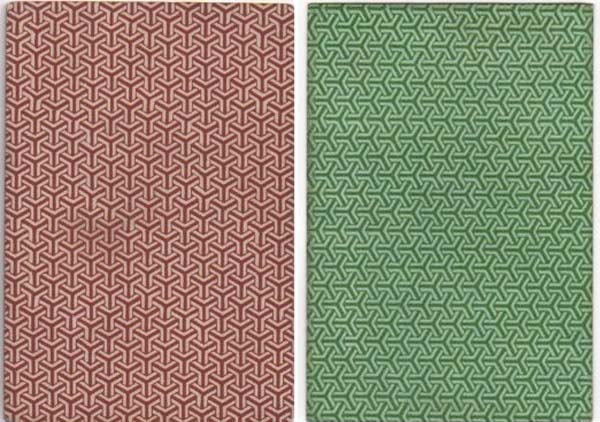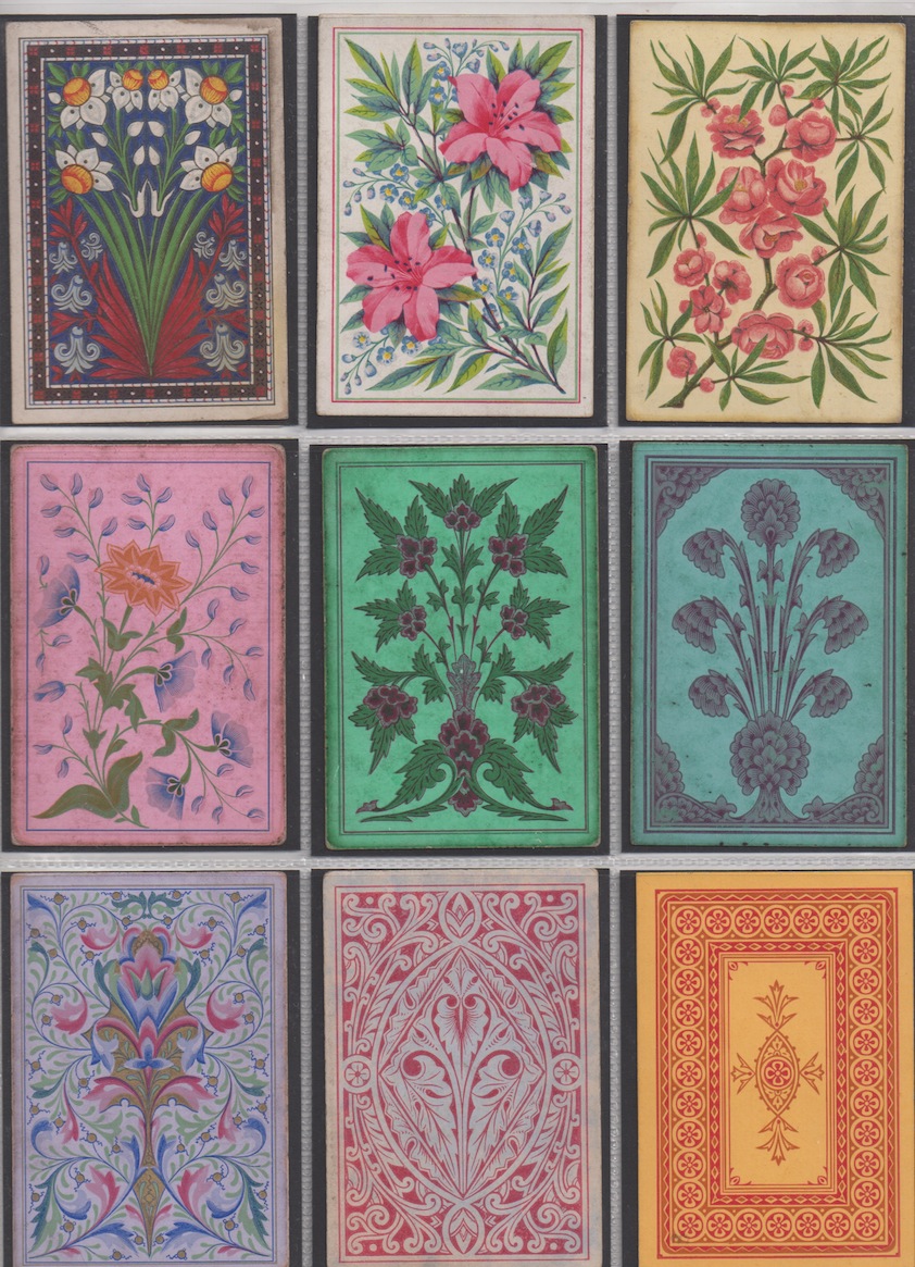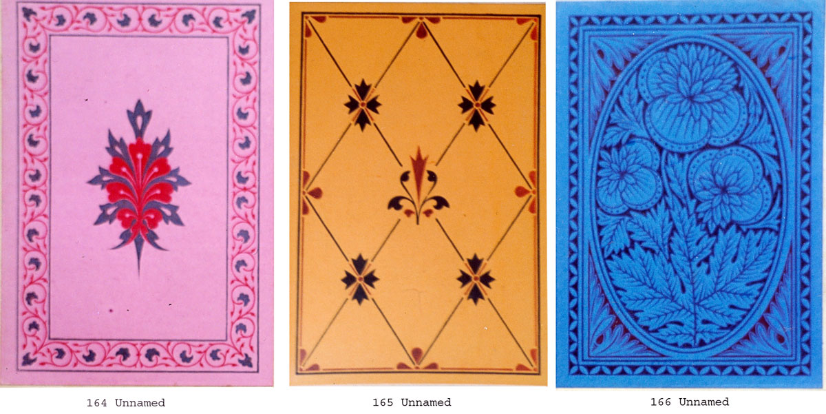 In the introduction to his Grammar he thanks a number of people who have helped him getting this tome into production. Two are his students: Charles Aubert and Albert Warren. Some of the preprint examples, which were glued down, have been removed from the albums to look at the reverse side. Some of these have annotations relating to which season they were used in and which designs they were paired with in double boxes (presumably bézique sets). Some also have signed initials or monograms on. These may be the designers or employees of De La Rue, who produced the plates from the initial sketches. Some actually bear the signed initials of Owen Jones. For example, the design I gave at the beginning, D399 Byzantine, is initialled by Jones. There are also designed initialled CA, which is more than likely an indication that Charles Aubert was the designer. These are designs from after Jones's death, including later floral designs and Japanese lacquer ones. Both examples below are initialled CA.