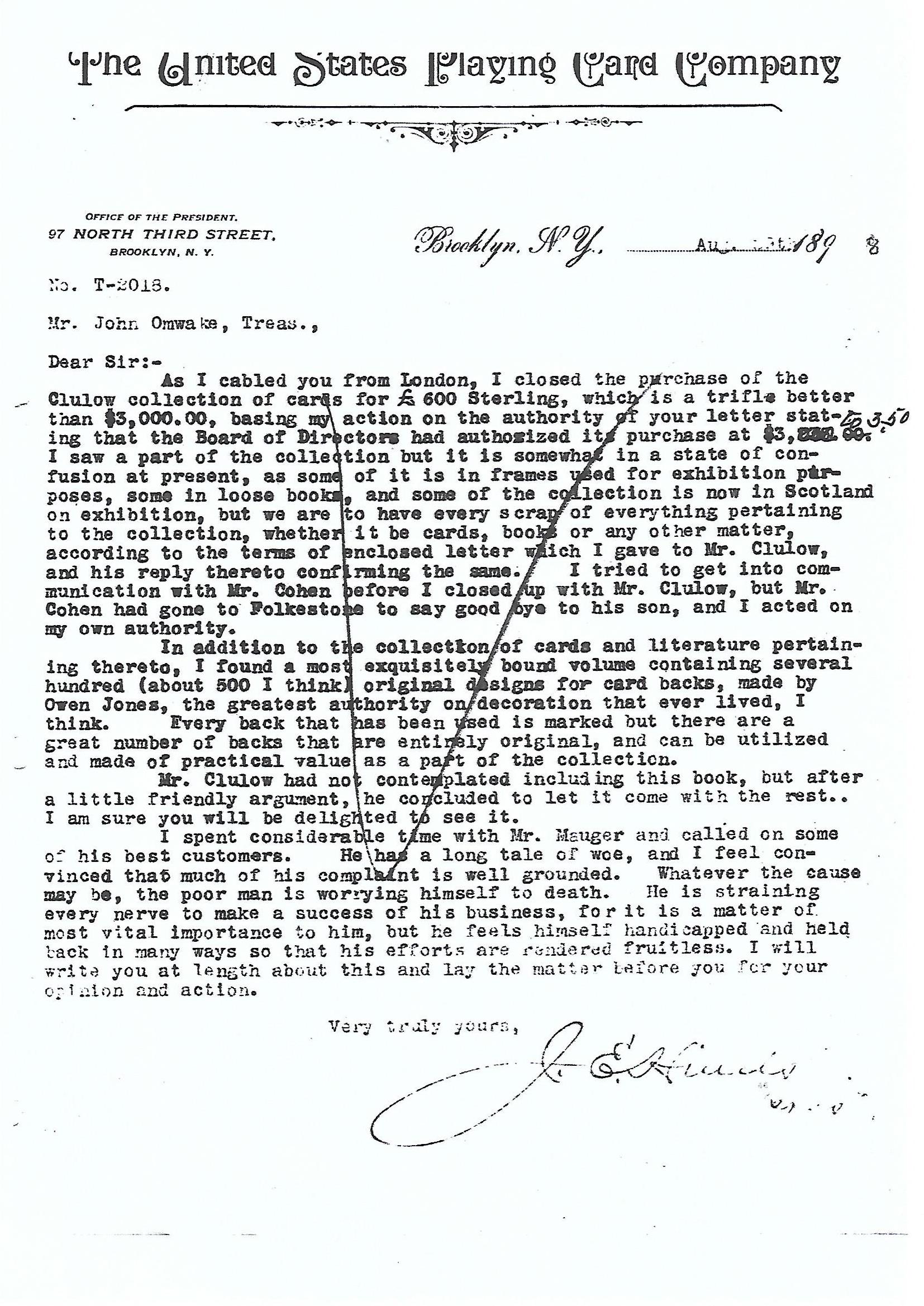 The late Mike Goodall kindly sent me a copy of a letter that refers to some 500 designs by Jones in a book from the Clulow collection. (In fact there are about 350 designs.) This book, along with the rest of the USPCC collection, is now housed in the Jean and Alexander Heard Library of Vanderbilt University in Nashville. It contains the original pencil sketches of Jones, some of which are identifiable card backs and others are small pieces of decoration that could be used in back designs. These designs are now digitized and are available online on the academic JSTOR platform. I recently came across evidence that USPCC used at least a few of Jones's designs in their own cards from c.1900-1920, as I have two examples of design number D577 by them in wide size and a revised version for the whist-size cards. In addition, I have a bridge-size, double-ended revision of one of the floral designs numbered D382 in the Clulow material.