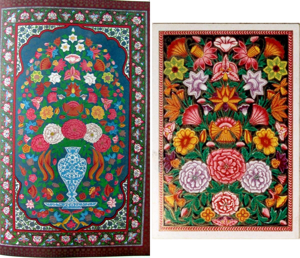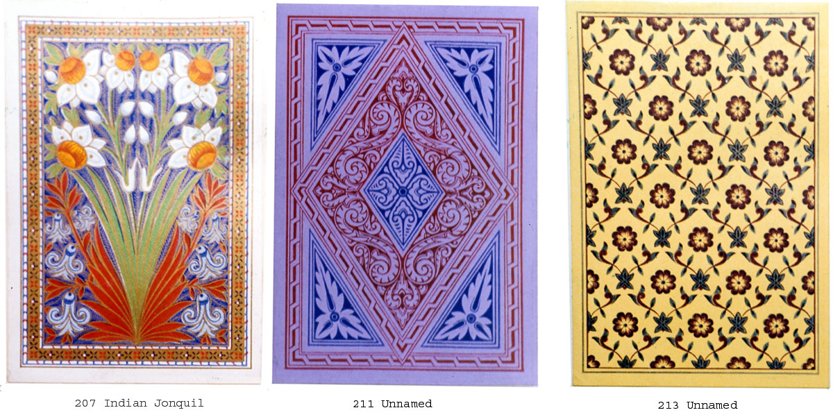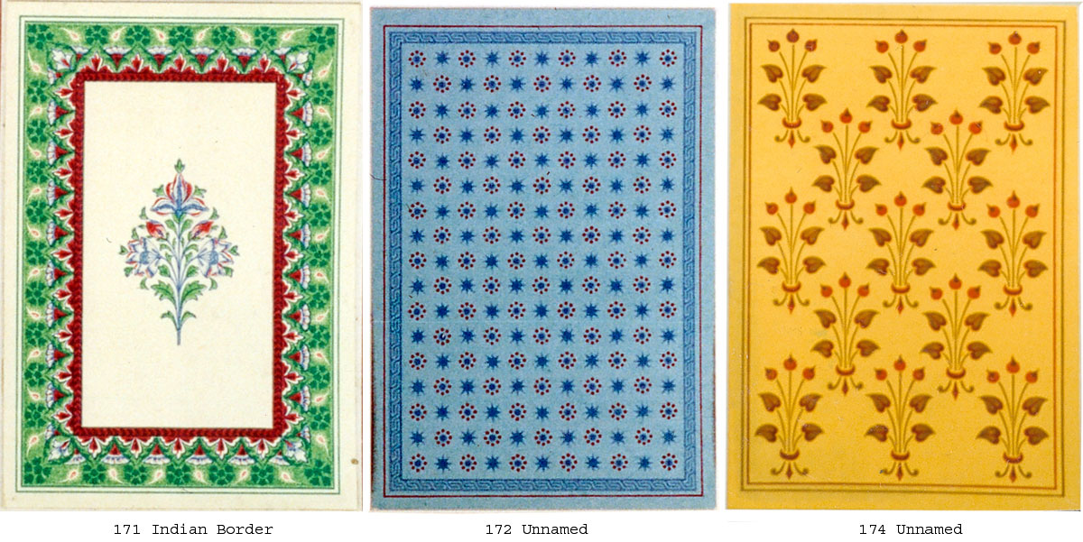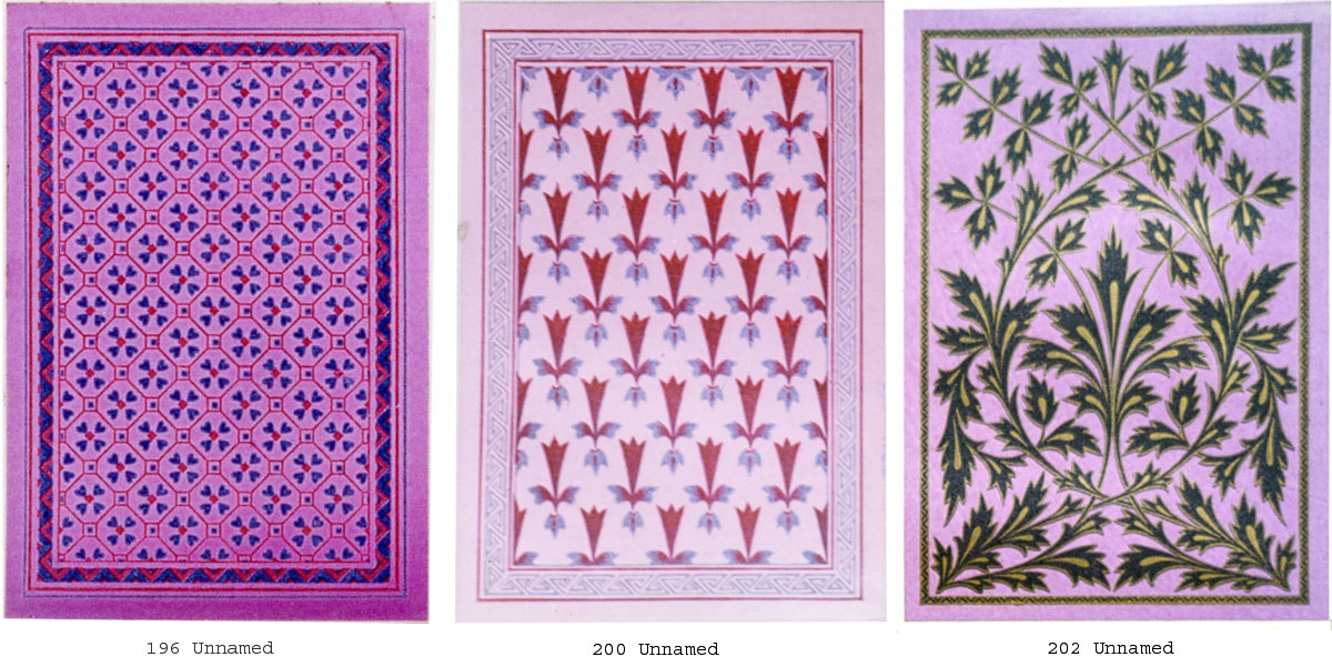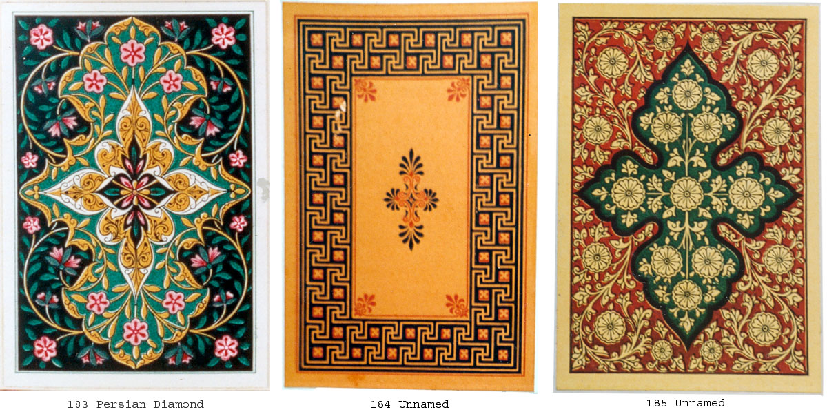 On the other hand, one particular design is taken directly from an Indian book cover with a few changes, illustrated in the Grammar as Plate LIV: S156 Indian Rose. I have no D-number for this design, but as it came from the Grammar, it may not have had one.