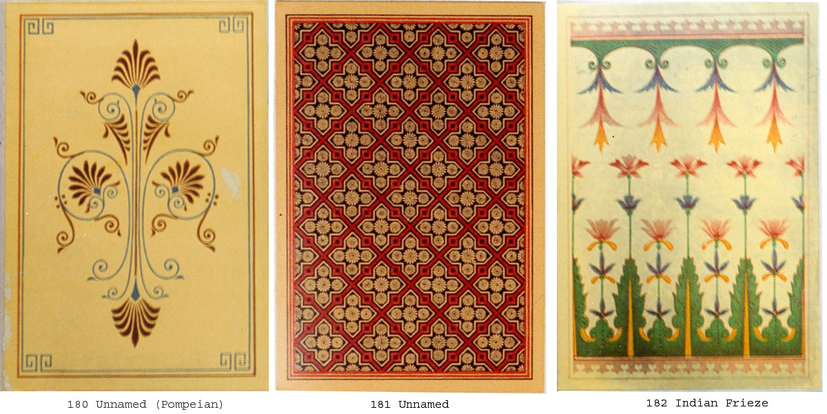 Jones liked to take non-representational designs from the sources in his book producing quite different results. These are often unnamed in the catalogues, but have clearly been influenced by the examples in the Grammar. For instance, there are Pompeian designs dated 1853 in the list, which may not be the same as ones used after 1862; there are four examples below, all of which were still available in 1870. Given the D-numbers, these must date from the late 1860s.