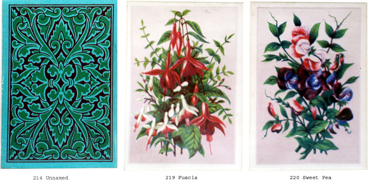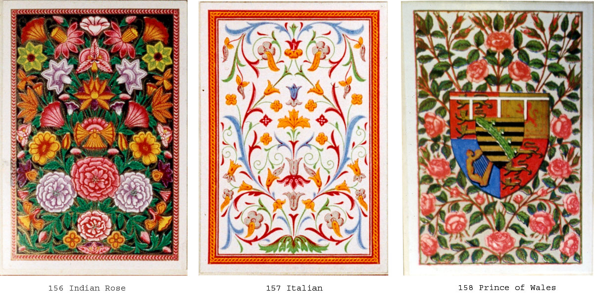 There is a trade list from Silver & Fleming, dated 1880, in the Victoria and Albert Museum, with a long list of De La Rue (and Goodall) cards that they supplied. The designs have two reference numbers: the first four-digit numbers in the list below are those of Silber & Fleming's stock with De La Rue's stock number to the right of the oblique.