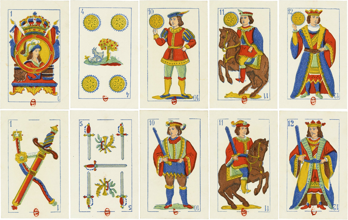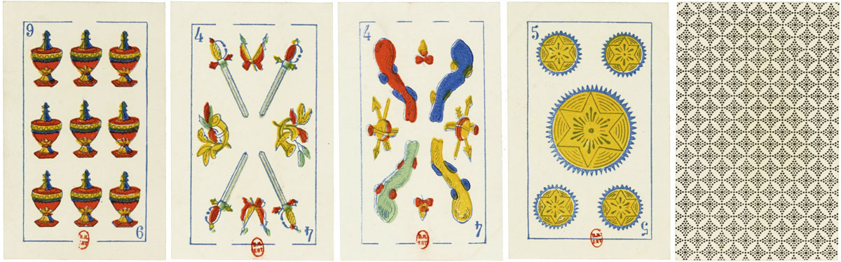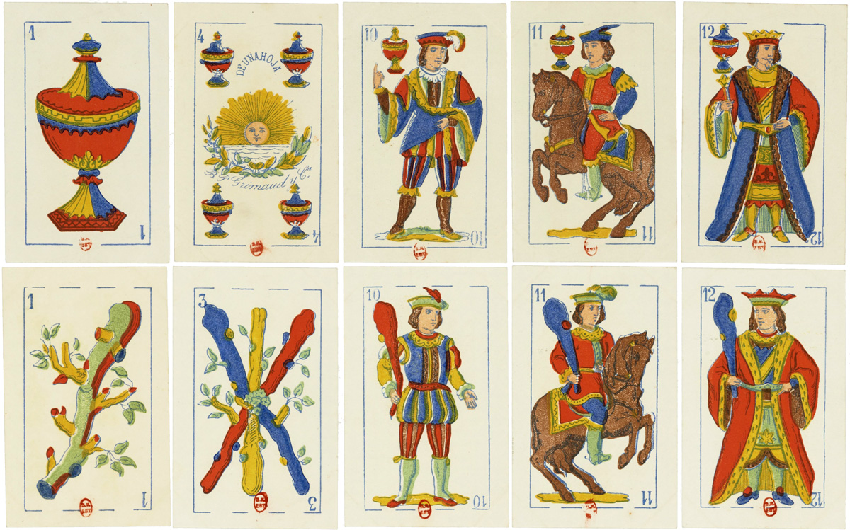 This brightly coloured version of the Spanish Catalan pattern was produced by B.P. Grimaud in Paris for sale in Bolivia, c.1860-1890. The four of cups has the inscription “De una hoja B.P. Grimaud y Ca” with a rising sun trademark. The four of coins has an image of two goats beneath a fruit tree while the ace of coins contains a central bust of a person wearing a plumed helmet within a crowned circular frame, mounted on a plinth carrying symbols of maritime trade with flags as a backdrop. There are no further inscriptions.