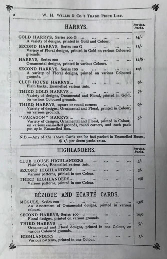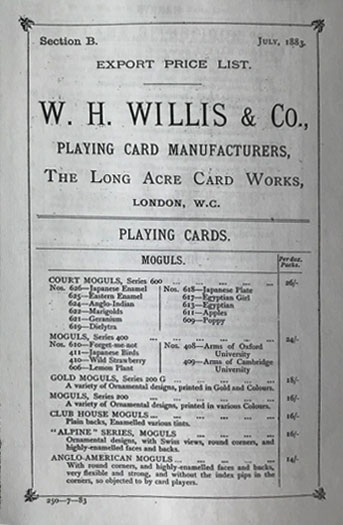 - The Willis price list is from “Minor British Playing Card Makers of the Nineteenth Century, Vol 1 W H Willis and Co”, by M H Goodall.