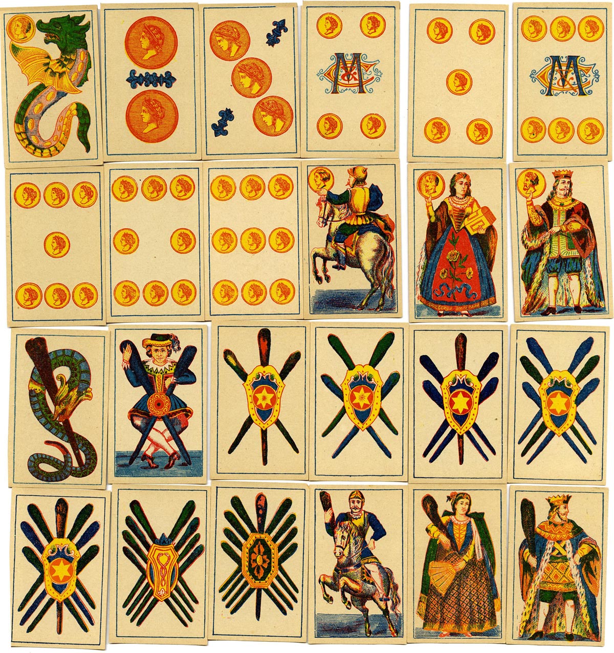Portuguese type pack with ‘dragon’ aces made in Belgium by Mesmaekers Frères, Turnhout, c.1875-1900....