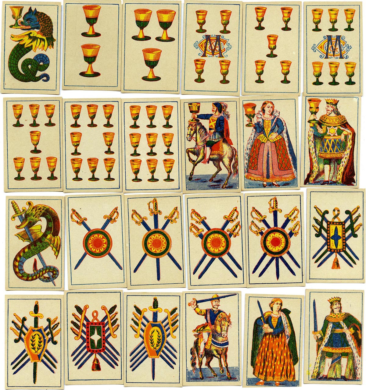 Portuguese pattern playing cards made in or for Brazil with maid, caballo and king (standing) as the court cards and dragons on the aces engaging with their suit-marks. The sixes and fours of coins and cups have on them the monogram M&C (possibly C&M). The batons and swords are straight and inter-crossed with shields at the centre, the two of batons has a man behind the crossed clubs. The coins carry a female bust. The pattern is believed to have been used in Brazil until around the end of the 19th century.