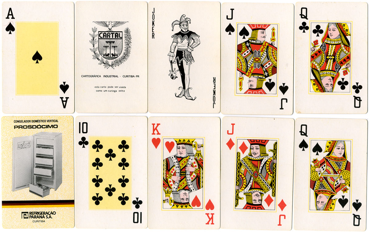 Above: the Joker, extra card and eight playing cards from a double advertising pack made by Cartográfica Industrial for Refrigeração Parana S.A. The standard English style court cards have a yellow border, wide margins and prominent indices. The extra card contains an insignia with the legend 'CARTAL'.