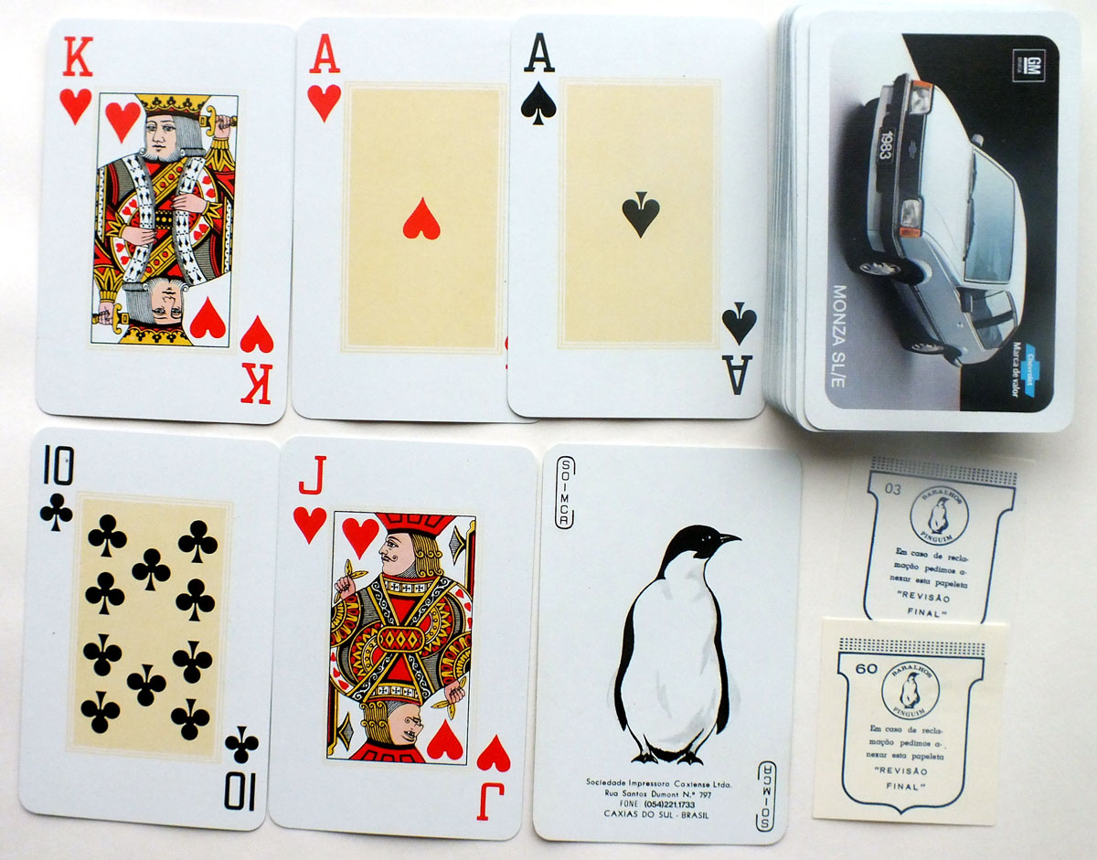 Above: Pingüim brand Anglo-American type playing cards with advertising reverse for Chevrolet / General Motors, 1983. The trade mark penguin Joker has been used, along with the internationally accepted copy of Fournier's large index Anglo-American courts.
