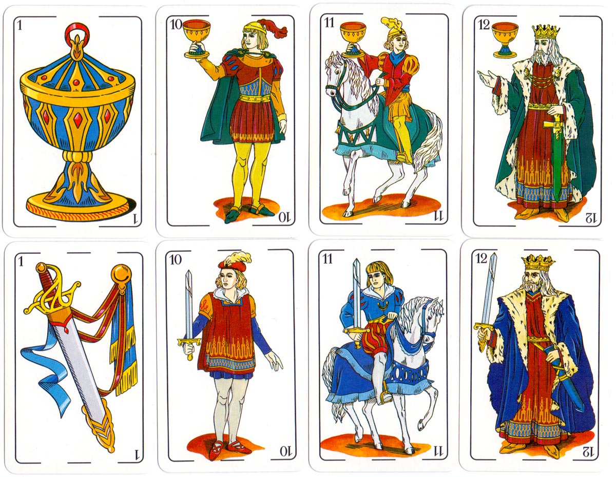 Above: new Spanish-suited playing cards designed by Gertre in 1993, 48 cards, published by SOIMCA. The designs were not well received by card players.