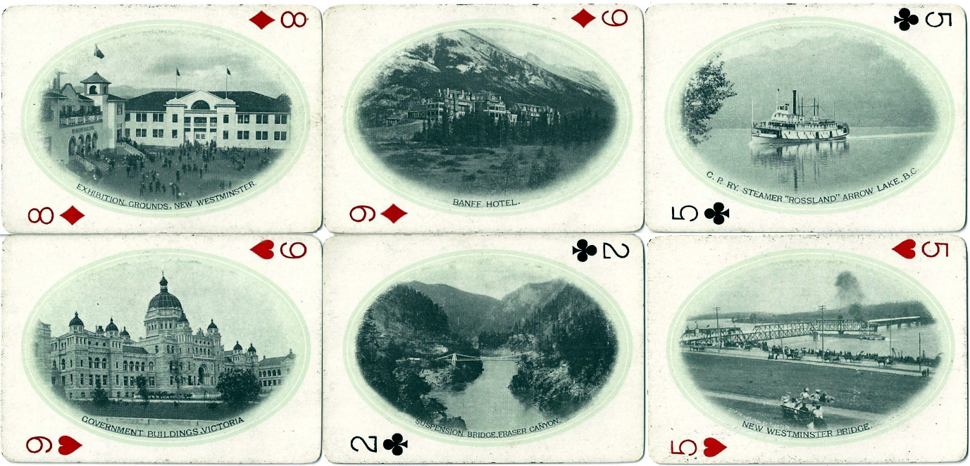 As well as being stockists of other brands, this deck represents their own attempt at publishing a deck. Aimed possibly towards the influx of immigrants from Europe, China, Japan and India into the regions, brought about by the completion of the railway in 1885, Clarke and Stuart produced this deck of cards, consisting of 52 green sepia shots of the region. Thanks to titles on each, we can have a reasonable stab at a date of production.