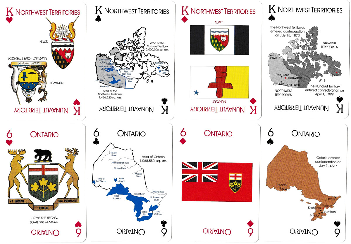 Produced by JK Productions of Richmond, British Columbia in 2002 this pack provides a wide range of information (in English and French) about aspects of each of the 10 Canadian provinces and 3 territories (the capital city, area in square kilometers, the date of entry into the confederation, mottos, coats-of-arms and flags, etc.). As data are also provided for the whole of Canada in addition to the 13 provinces/territories, the Northwest territories and the Nunavut Territory share a card (the king of each suit). There are two extra cards with the words of the national anthem and two others detailing card games that can be played with the pack. All information is in both English and French. See the box►