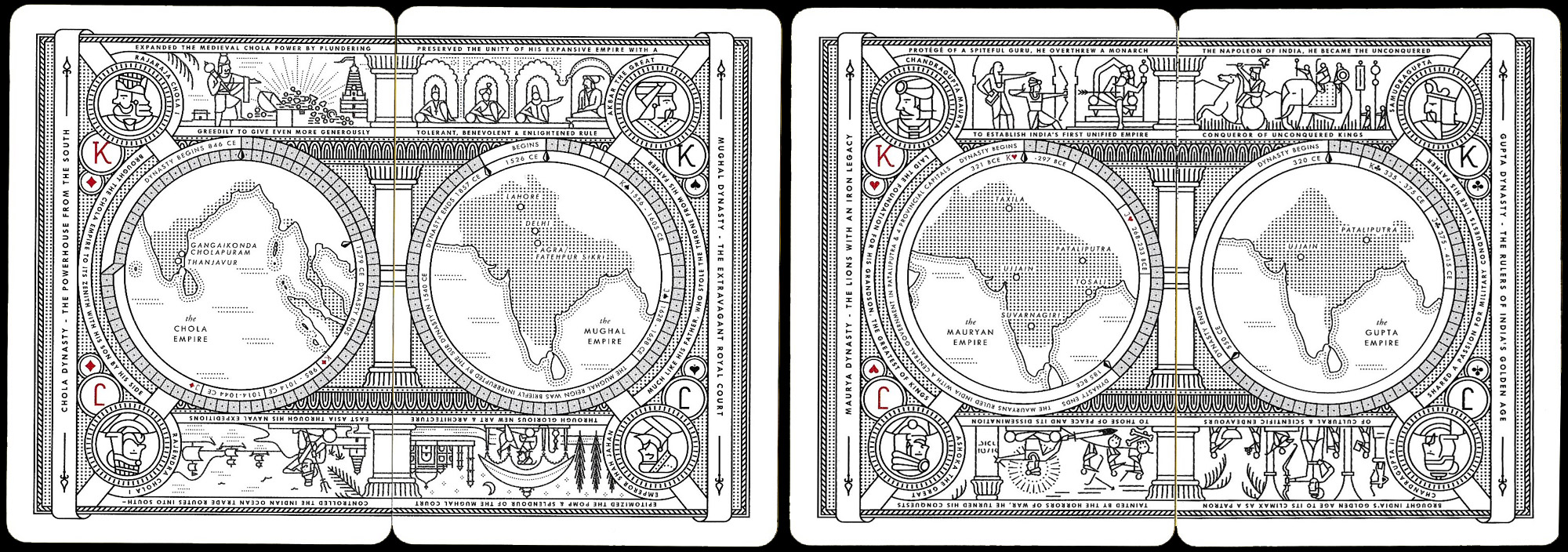 The four greatest dynasties of India are illustrated in detailed black-and-white drawings on the court cards, while the elaborately designed Aces provide historical information. Hearts represent the Maurya Empire (the lions with an iron legacy, 322BCE – 185 BCE); Clubs - the Gupta Empire (rulers of the Golden Age, 320 CE – 550 CE); Diamonds - the Chola dynasty (the powerhouse from the south, 848 CE – 1279 CE); and Spades - the Mughal Empire (the extravagant Persian courts, 16th-19th century). Each court card reveals a legendary monarch of India, his queen and future successor. For more information see here►