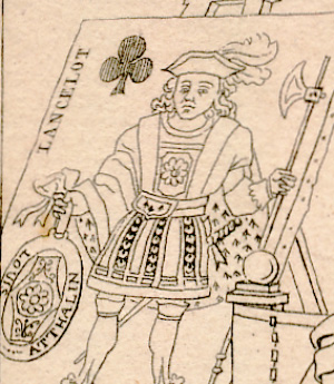 The Jack of Clubs is really interesting as it is a self portrait with Atthalin designing playing cards and his son [?] examining the cards. The name 'Louis Atthalin' appears in the shield on the legendary knight – Lancelot.