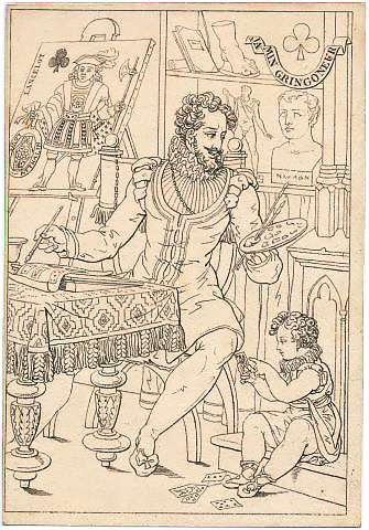 Above: The Jack of Clubs showing Atthalin designing the playing cards and his son examining the cards.