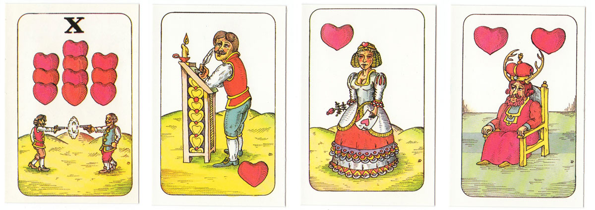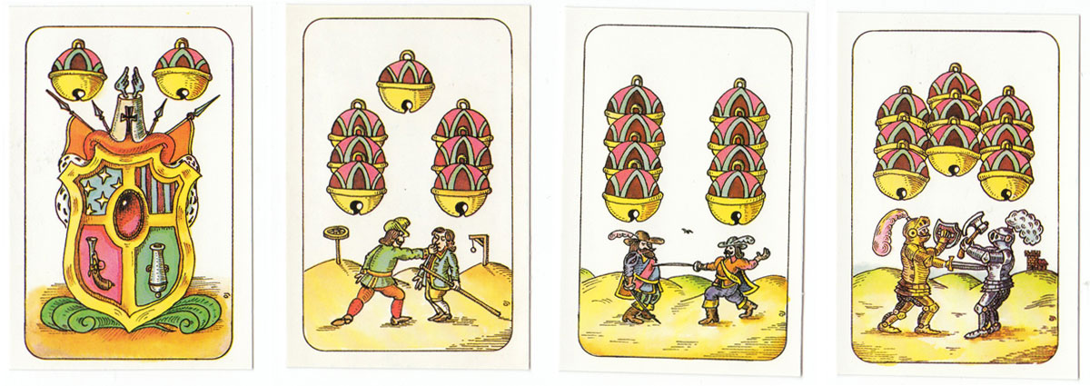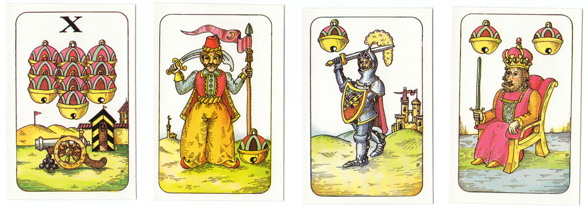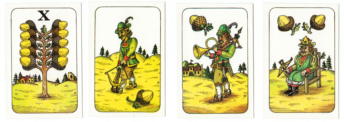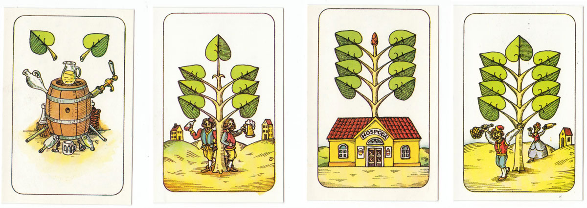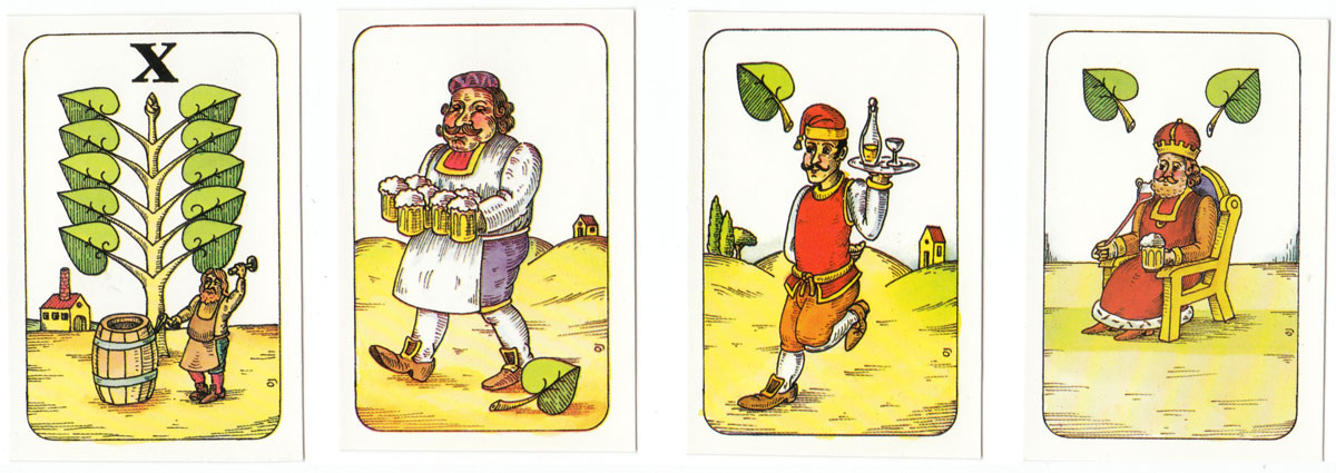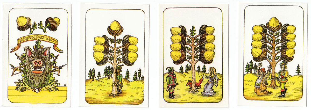 A humourous re-interpretation of the Czech national pattern published by Ceská Státní Pojišťovna. The traditional Germanic suit symbols of acorns, bells, hearts and leaves have been preserved, but the illustrations have been updated in a comic style. The cards have square corners and no indices except on the tens. 32 cards.