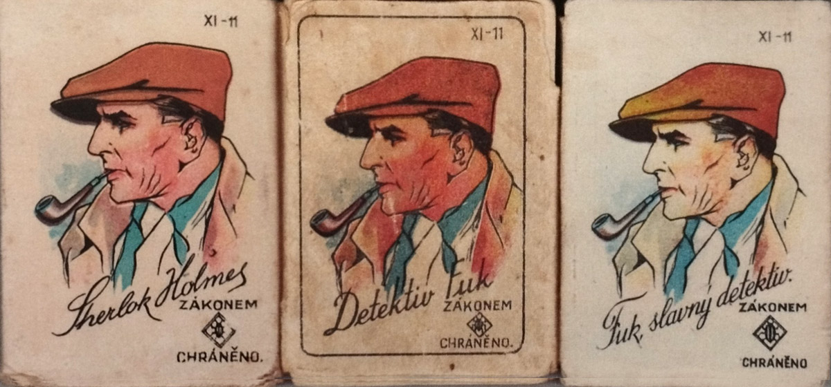 ‘Detektiv Fuk’ card game from the former sovereign state of Czechoslovakia in Central Europe, depicting the detective in various intrepid actions, clearly ‘on the ball’, often smoking his pipe whilst solving mysteries for his multi-millionaire clients.