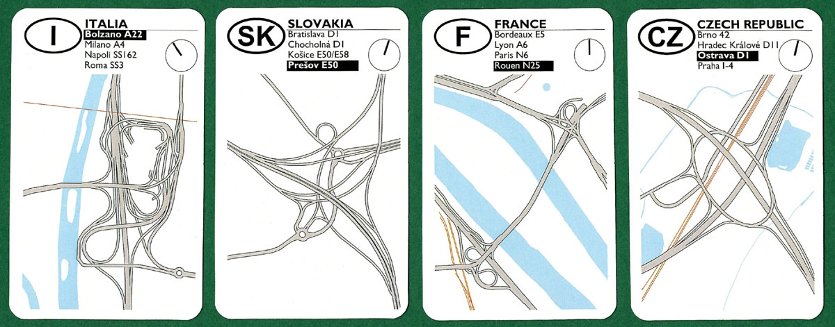 When my colleague and I decided to start a business publishing cards, we certainly didn't want to make explicitly children's games like memory games and quartets. But it was only a matter of time before a topic came up that would deserve such a solution, and the trigger was a trip to Italy. Everyone has a navigation system on their phone these days, but we still found ourselves in no man's land in Bolzano - in a truck parking lot inside an intersection. In the evening, calmly, while checking back, the amazement at this Gordian knot in the landscape sparked an interest in interchanges, which was the reason for the creation of this card pack. As "local" patriots, we chose only European solutions, it is clear that the USA, Japan and now even China are definitely ahead with their intersections.