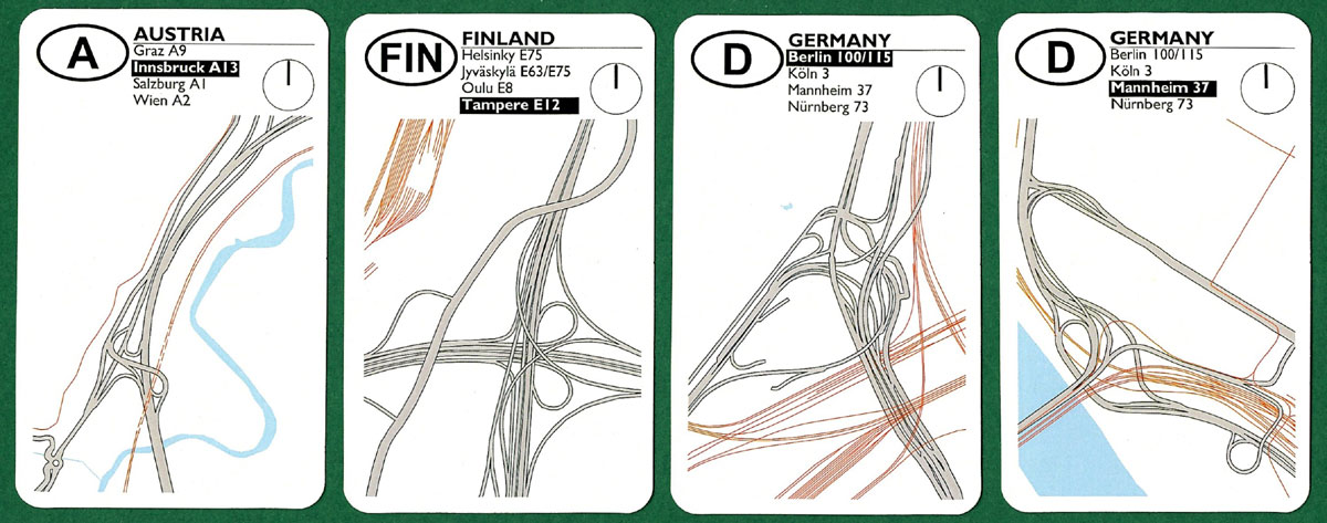 36 cards organized into nine quartets each offer 4 intersections from one European country identified by city and road number. The capital of the given state is always included and the intersections are chosen with regard to their interesting shape. The graphics of the cards are minimal and in addition to the shape of the intersection itself, they also show railway lines and bodies of water. All intersections are drawn to the same scale and the north allows for their orientation.