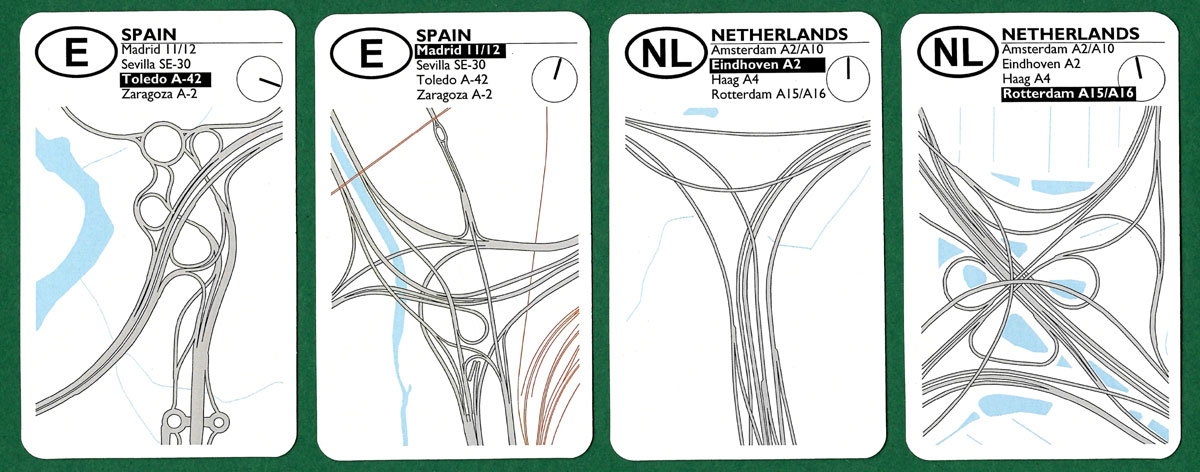 Above: The European Interchanges Quartets card game published by Counter Clockwise, Czech Republic, 2022. 36 cards + legend in box. The cards shown present the second edition of this deck from 2024, when some intersections and states were replaced.