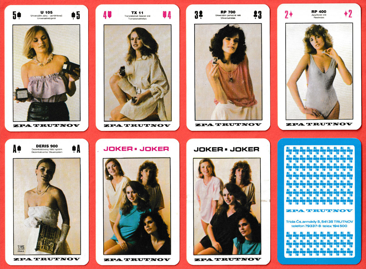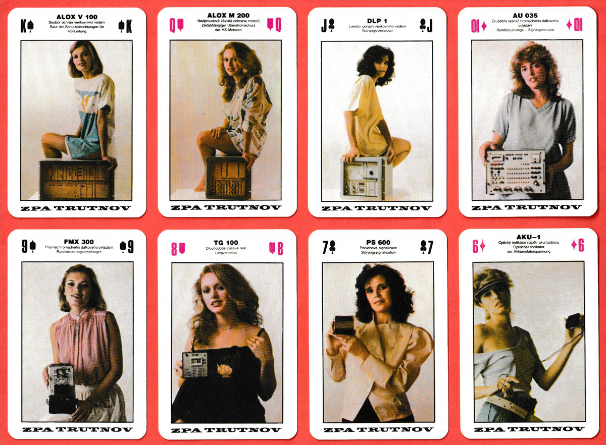 ZPA Trutnov was the old name for the Czech company ZPA Smart Energy which nowadays produces smart meters. Back in 1988 it was clearly thought necessary to use glamorous young ladies in a variety of costumes to promote some very unglamorous products, such as mains receivers and electrical control units. Each product is named at the top along with the indices, with the name of the company at the bottom of every card. All 54 cards are different, although only 13 different products are shown. The maker’s logo appears on the Ace of Spades. Note the error on the 10 of Diamonds where the number 10 has been reversed by mistake.