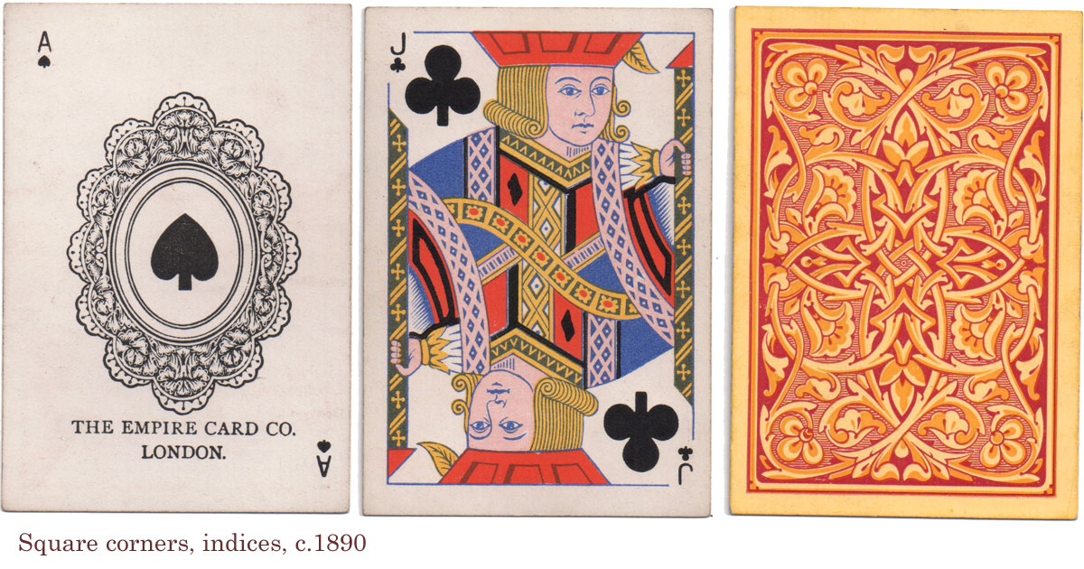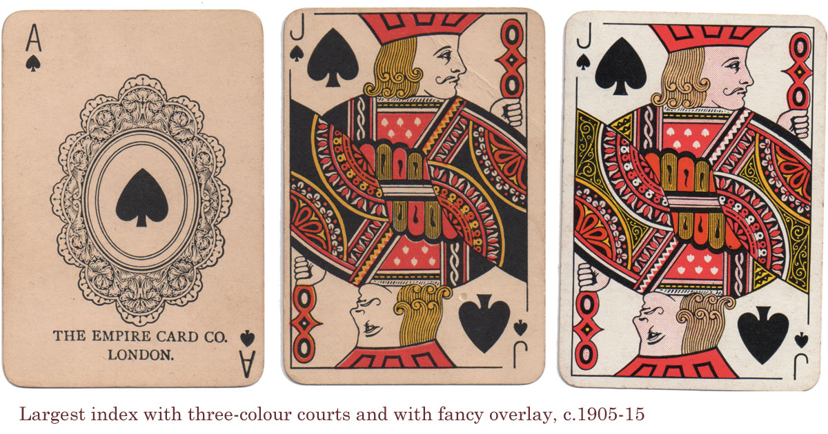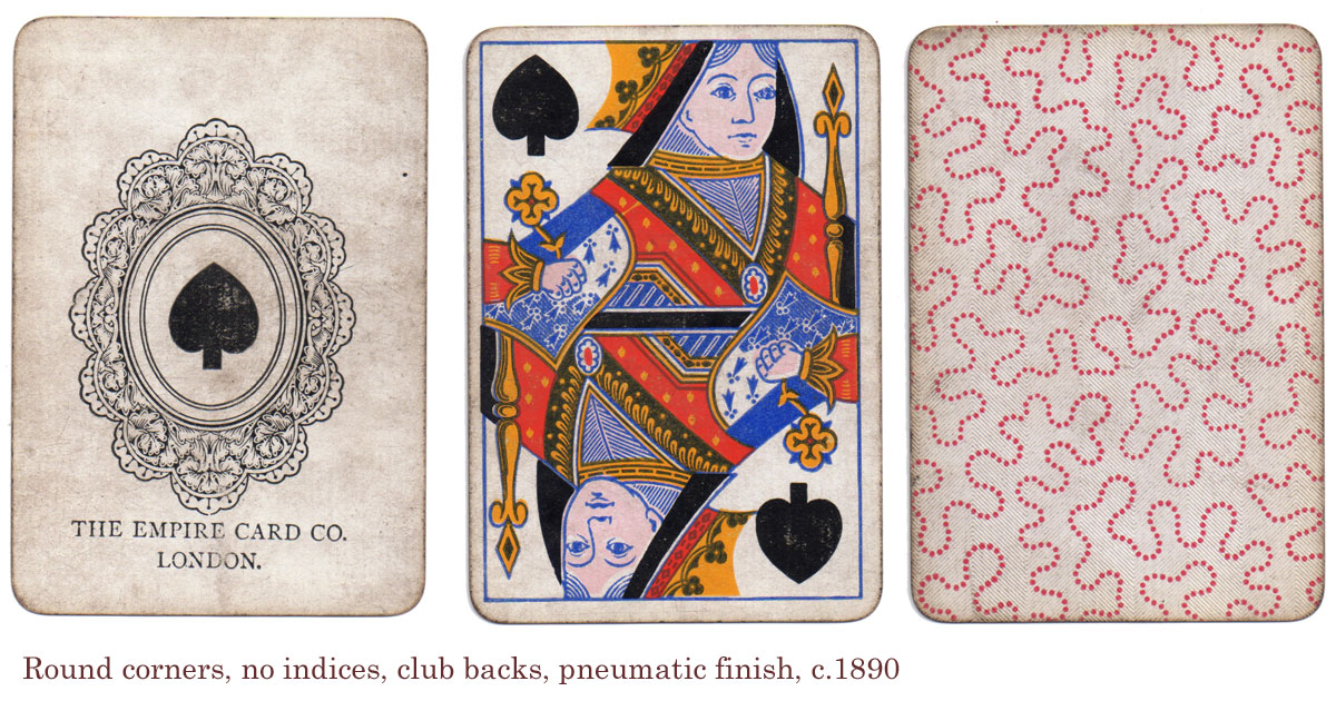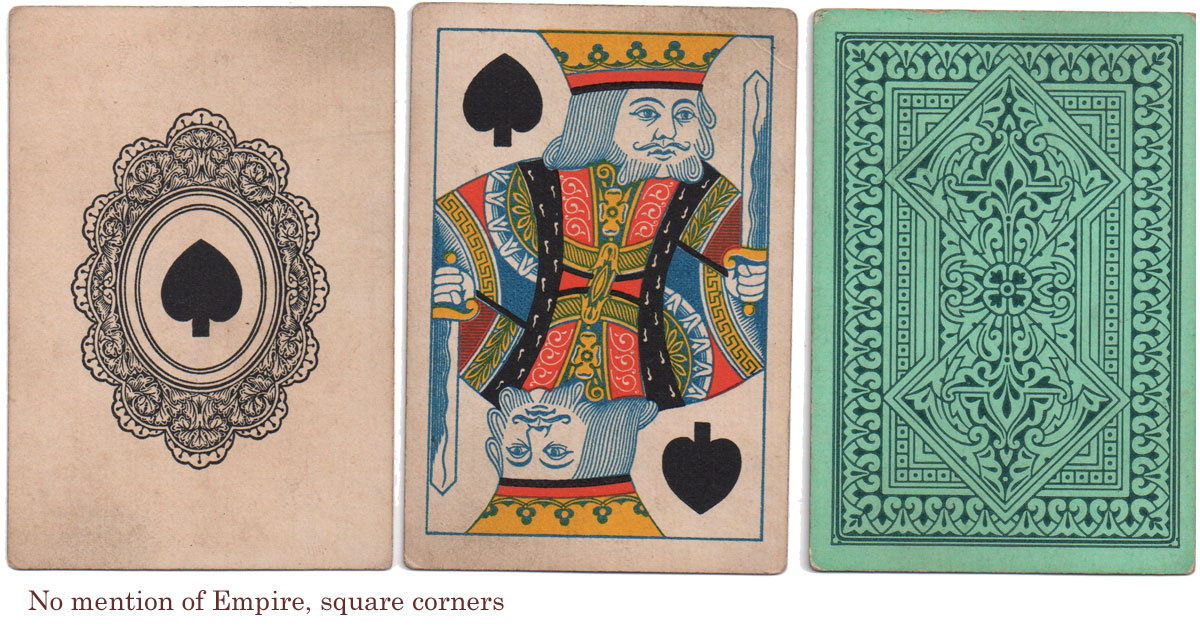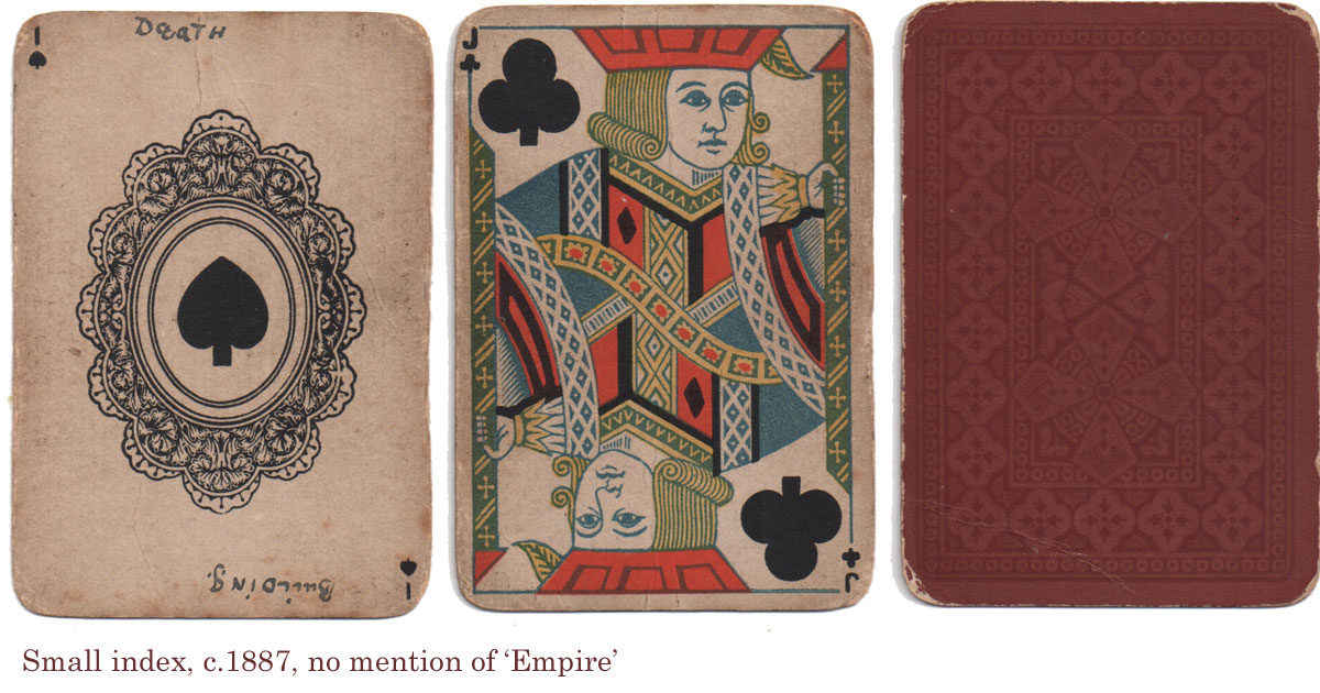 More examples of playing cards by the Empire Card Co., the subsidiary of Thomas de la Rue & Co (active c.1888-1915). It's not clear whether the doily ace predated the Empire Card Co.