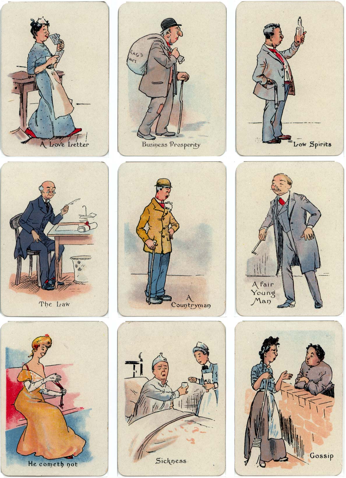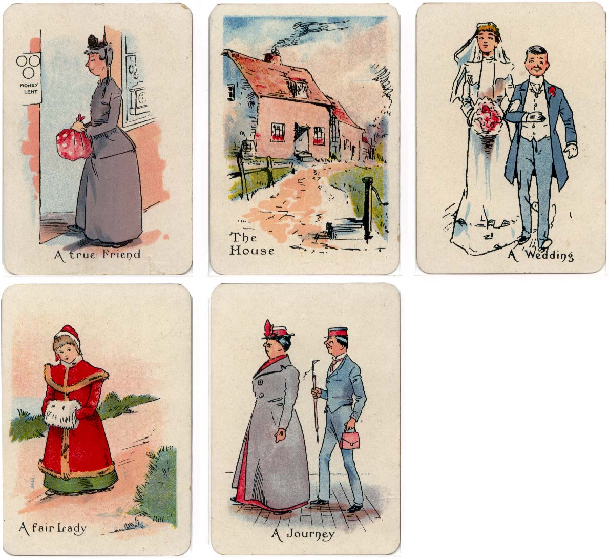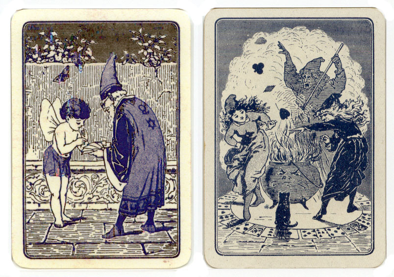 The cards have no suit symbols or numbers, just a title. At least two different back designs are known. The same images were also published as “The Wizard Fortune Telling Cards” by Milton Bradley Co (Springfield, USA) in 1908 with plain cream backs.
