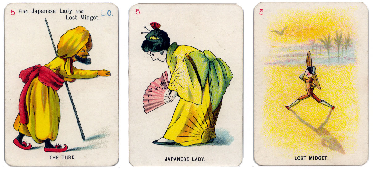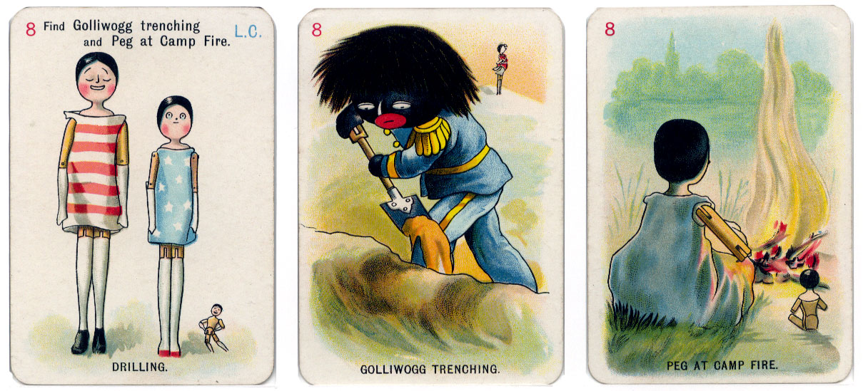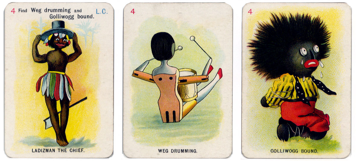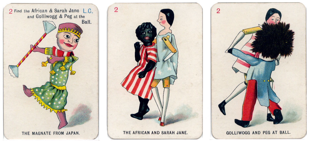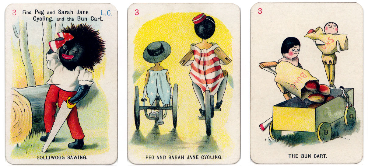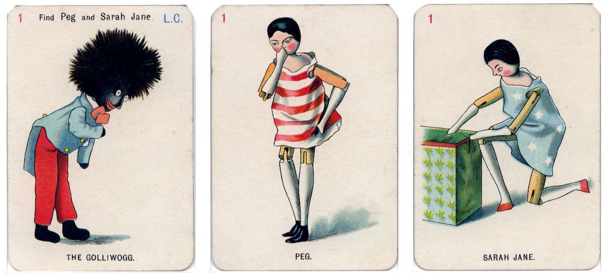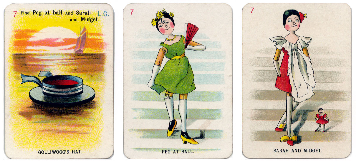 Above: selection of cards from the “Golliwogg” card game illustrated by Florence Kate Upton (1873-1922) and published by Thos de la Rue & Co Ltd by arrangement with Messrs Longmans, Green & Co, c.1902. See an alternative box and back design►