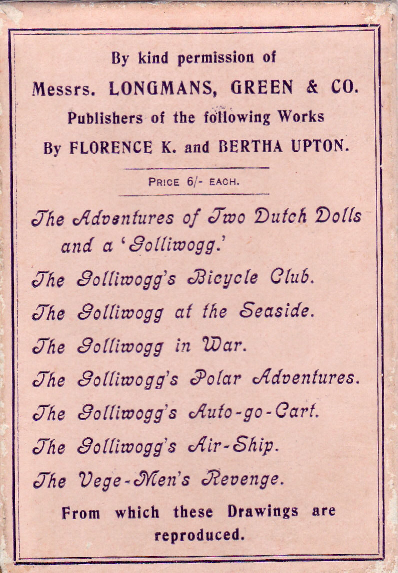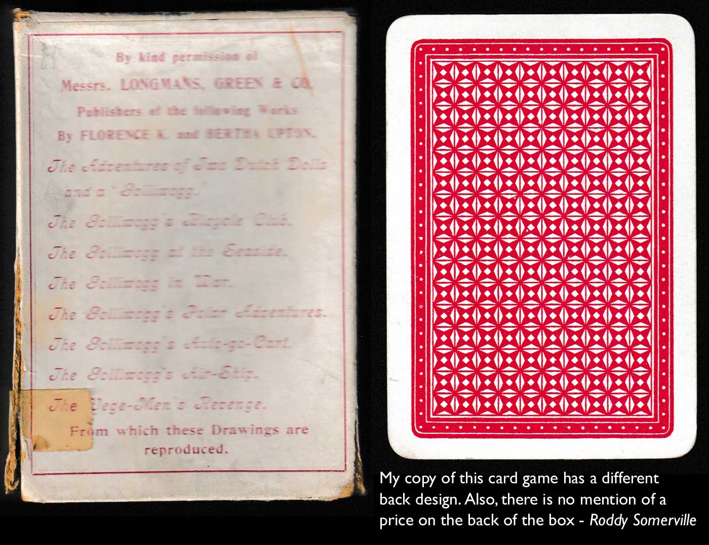 The same applies to the historical De la Rue card game which is based on the first seven Golliwogg books as shown on the rear of the box. This is a great aid to dating the card game because it confirms that it appeared before “The Golliwogg’s Circus” in 1903. The only other book that the Uptons published was called “The Vege-Men’s Revenge” published in 1897 but it never was as big a seller as the Golliwogg series.