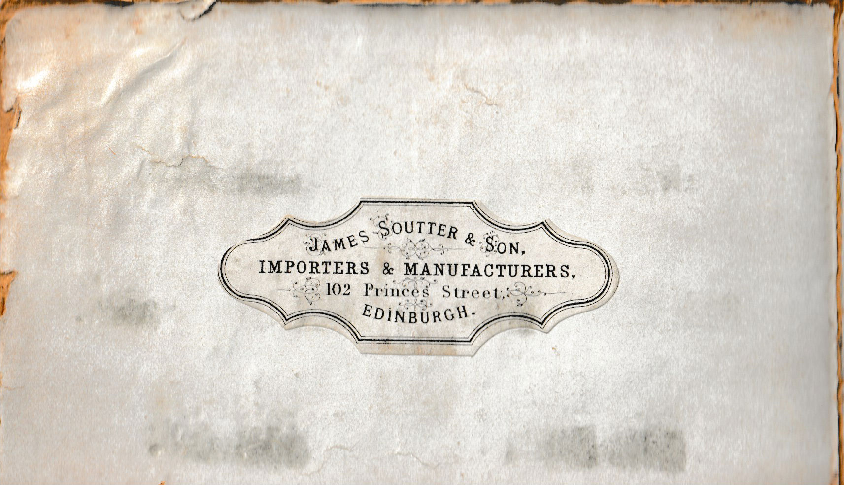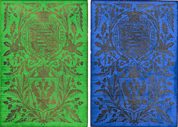 For this pack, back colours other than the one shown were also produced, notably green and blue (click to zoom). I have these green- and blue-backed cards in a Bezique set (box top marked "The Royal Game of Bezique"). The game of Bezique had only been introduced into the UK from France about ten years before the marriage of the Duke of Edinburgh and Princess Alexandra of Russia in 1874. It is said that the Duke of Edinburgh was among those responsible for the spread and popularity of Bezique in the UK as he apparently became addicted to the game while on his travels. Another nice tie-in is that this set was sold by a company in Princes Street, Edinburgh, by the name of James Soutter & Son (see scan of label in box lid). So, cards for Bezique, a game made popular by the Duke of Edinburgh, were being sold in Edinburgh, commemorating the Duke of Edinburgh's marriage.