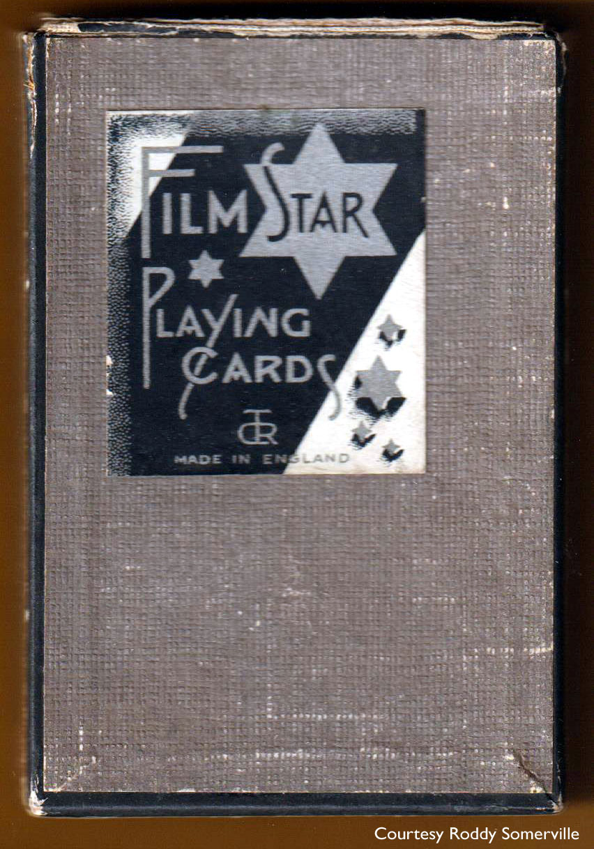Above: 'Film Star Playing Cards ' for Metro-Goldwyn-Mayer manufactured by De la Rue & Co., London, 1933. All the court cards and Joker are printed in red, yellow, green, black and white. The court cards are the same at each end except the Jack of Diamonds. Printed by offset-litho. Double pack 2 x (52 cards + Joker + contract scoring card). Red/silver and black/silver backs. Images courtesy Barney Townshend.