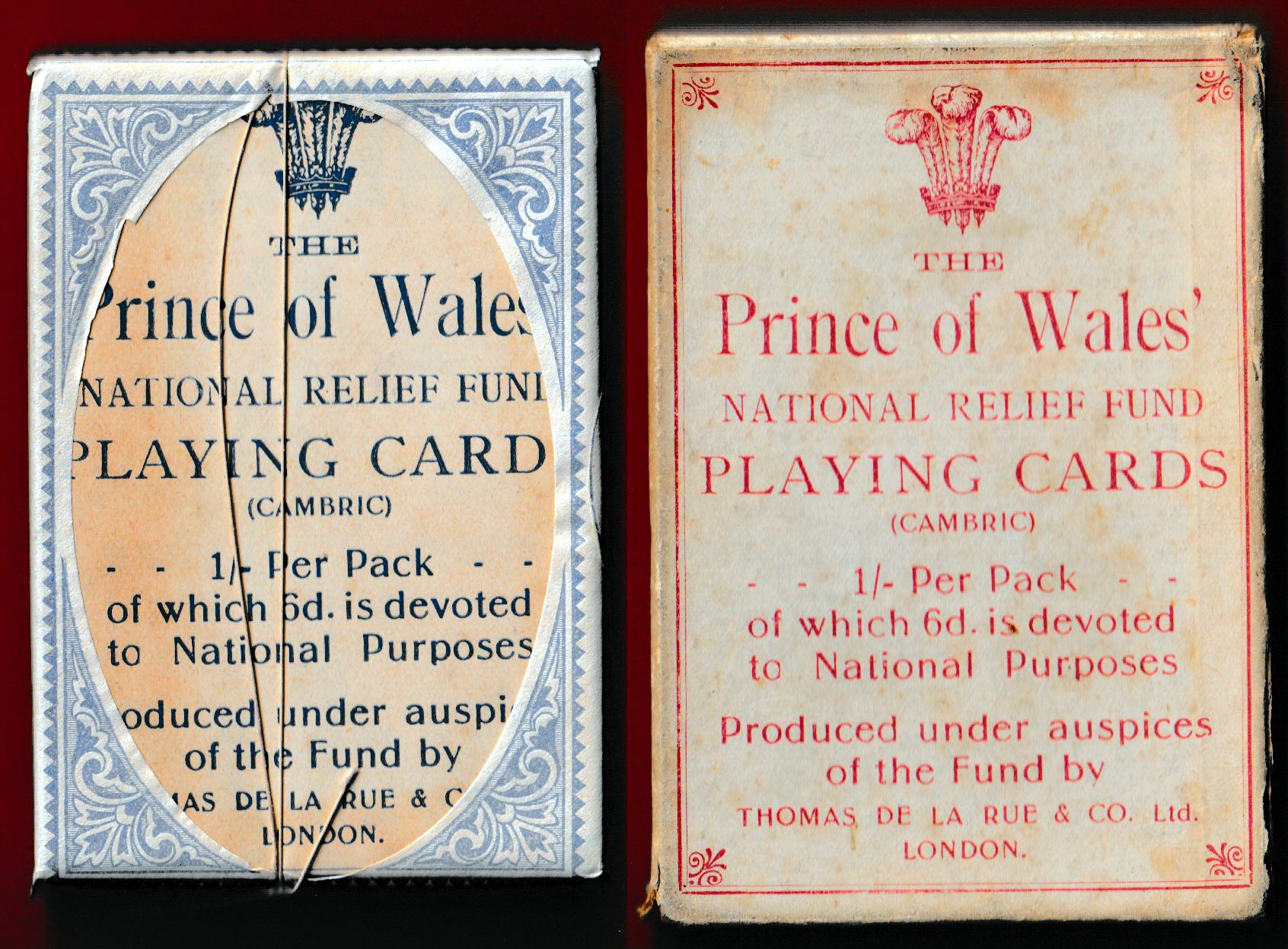 Above: a two-pack patience set produced by Thomas De la Rue on behalf of the Prince of Wales National Relief Fund in 1914.
