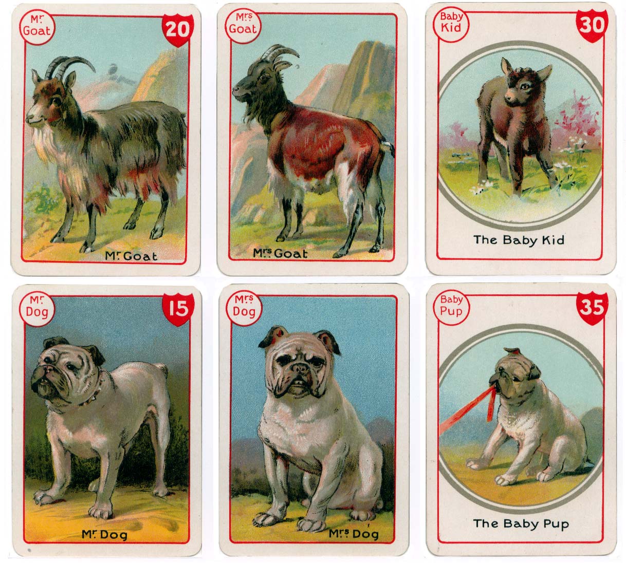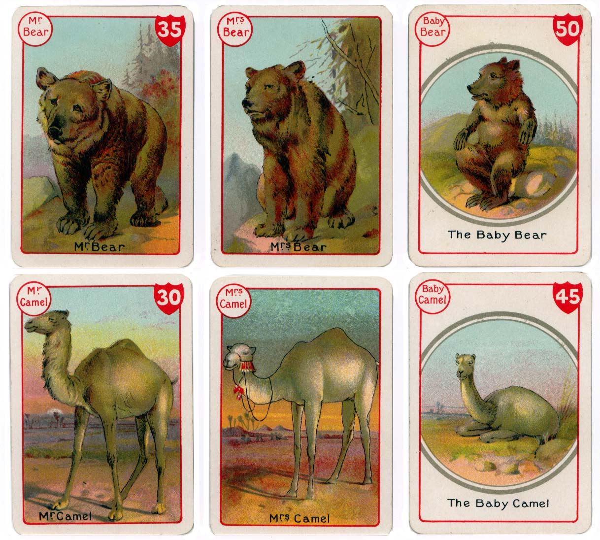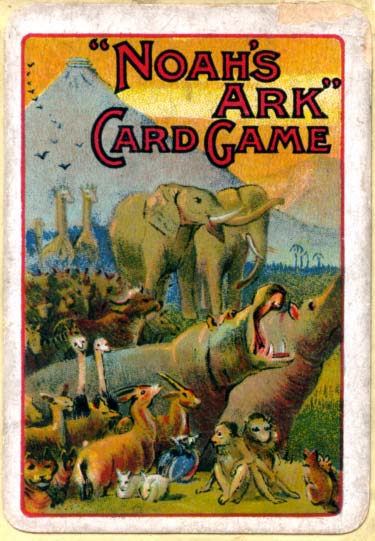 Noah's Ark family card game, first published by De la Rue for Gibson’s Games in c.1905, involves collecting matching sets of animals - father, mother, and the baby – which are placed face upwards and said to have entered the ark. There are 17 sets in total, each with different point values, plus a single card representing Noah, who plays a decisive role in the game. The antique chromolithographic illustrations of farm and zoo animals, which in their day helped to teach the Old Testament worldview, have been re-printed several times. See the Rules→