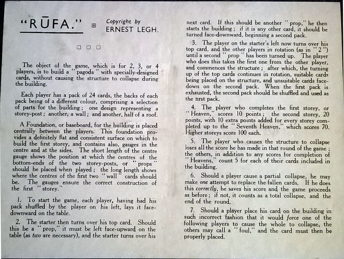 Rūfa is a game designed by Ernest Legh and manufactured by Thomas De la Rue, first registered in 1934. The object is to build a pagoda with specially-designed cards without causing the building to collapse. See: the rules→