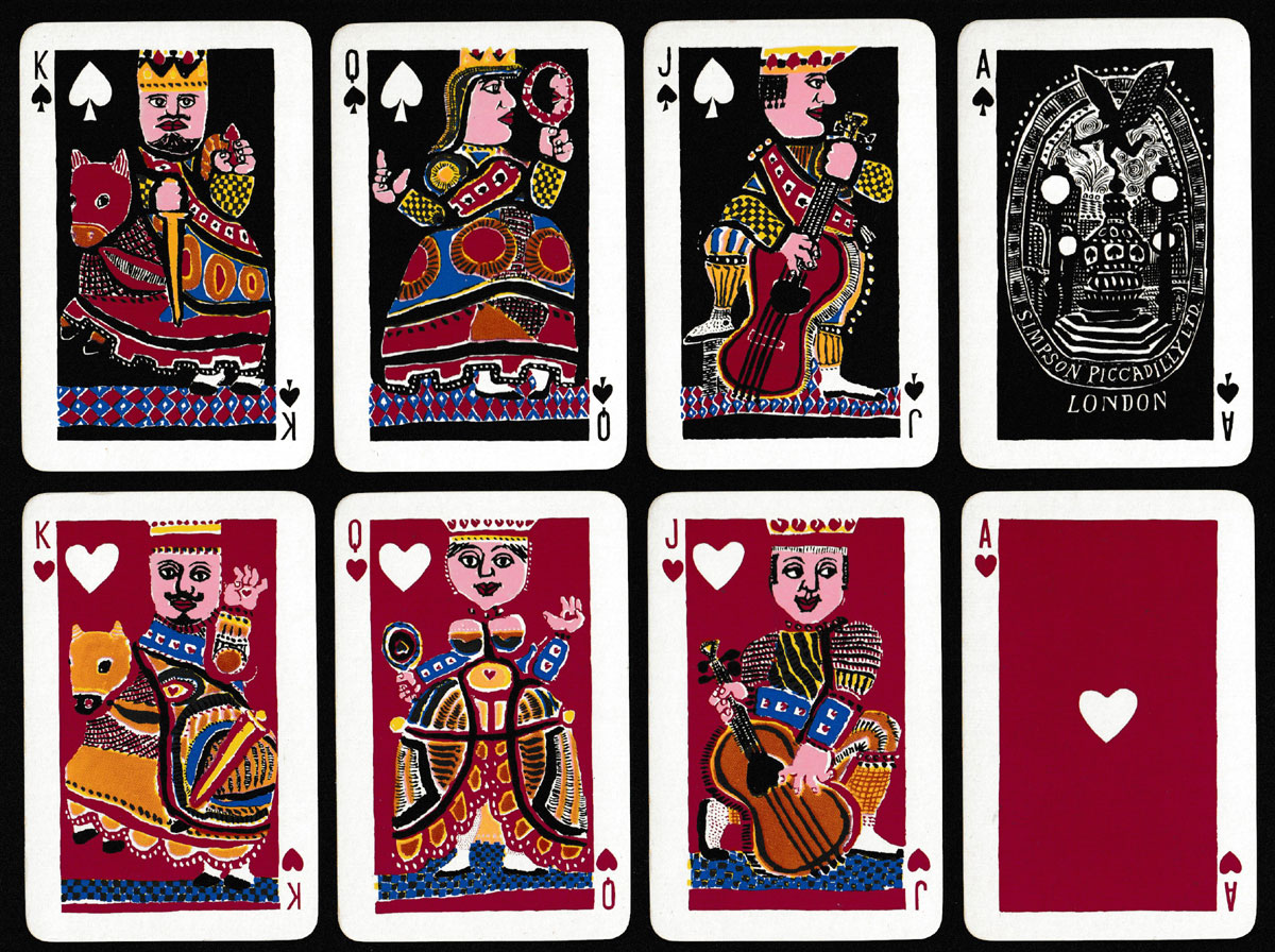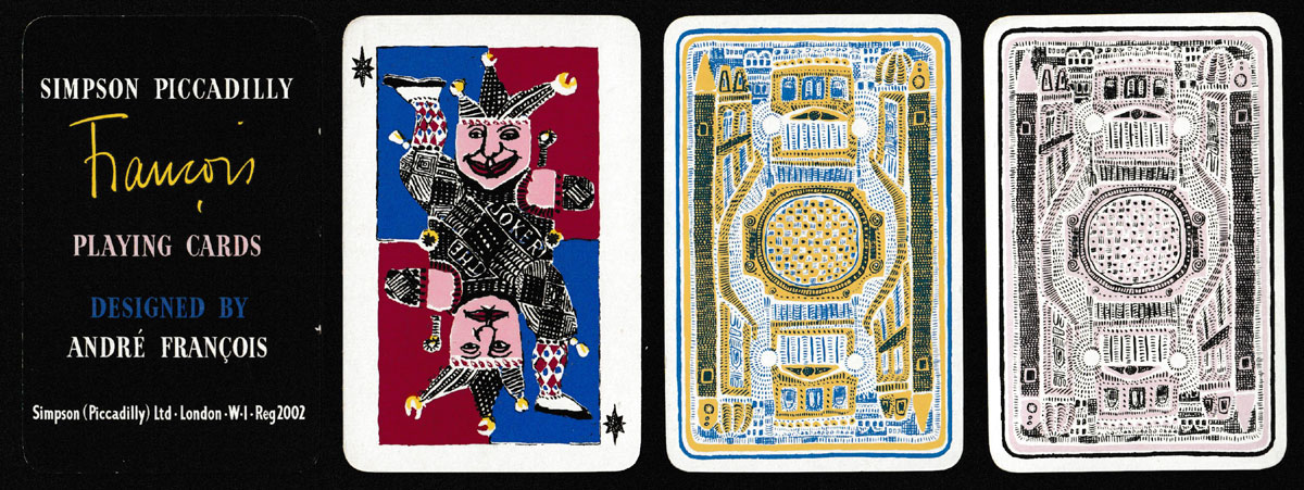 Above: Simpson (Piccadilly) playing cards designed by André François and made by Thomas De La Rue, London, UK, 1953. 2 x 52 cards + 2 (identical) Jokers + 1 title card, in slender black box with hinged lid. Size: 58 x 89 mm.