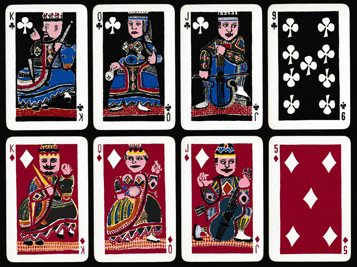 When these cards were issued in 1953 (just 8 years after the end of World War II), André François’ designs must have seemed as bold and innovative as the building in Piccadilly housing the business they were advertising. Within white borders where the indices are placed are solid areas of red or black, against which the pips are picked out in white. The Kings are hobby-horses, the Queens hold hand-mirrors, while the Jacks play stringed instruments. The (double-ended) Joker is a jester on a quartered red and blue ground. The Ace of Spades shows the statue of Eros in Piccadilly Circus by night. According to John Berry’s description, a double-ended sketch of the Theatre Royal, Haymarket, seen from St James’ Square, adorns the backs. The cards have yellow edges. They are often to be found slightly bowed.