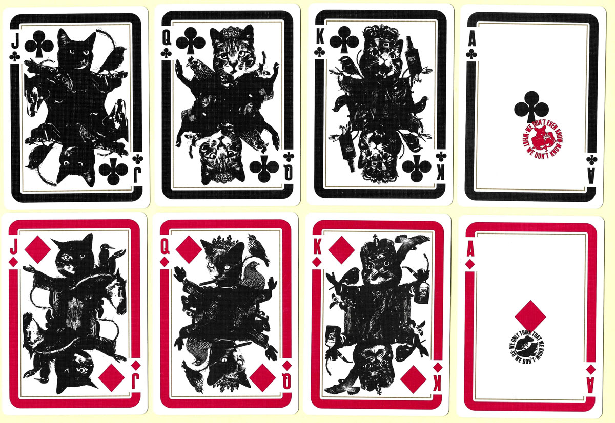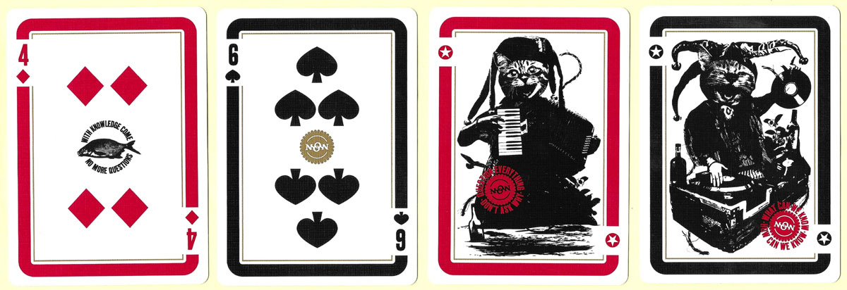The court cards are in the form of heavily drawn pen-and-ink cat figures, there are Rumsfeld-type quotes on the aces (e.g. “We don’t even know what we don’t know”), a single quote on the four of diamonds (“With knowledge come no more questions”), and the word “Møn” on the sixes of each suit. All cards, including the two jokers, have either a thick red or black border.